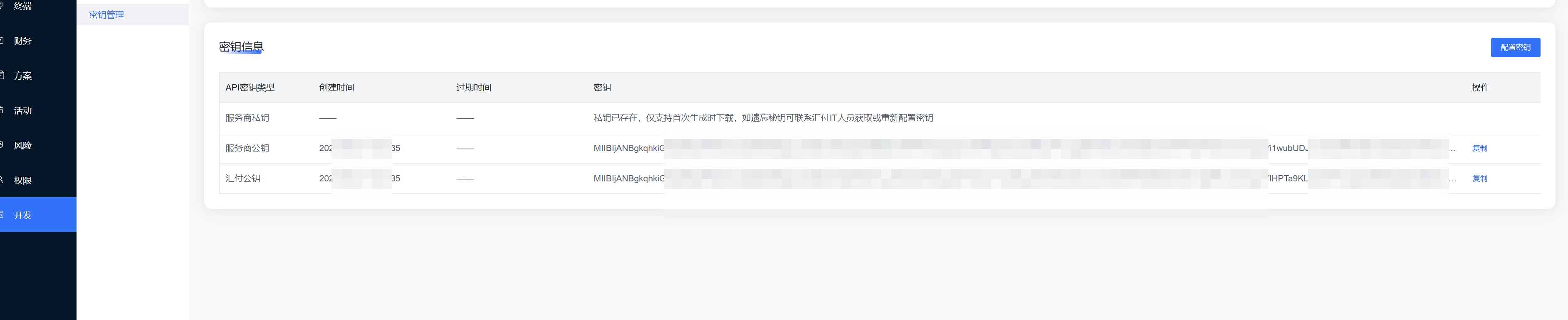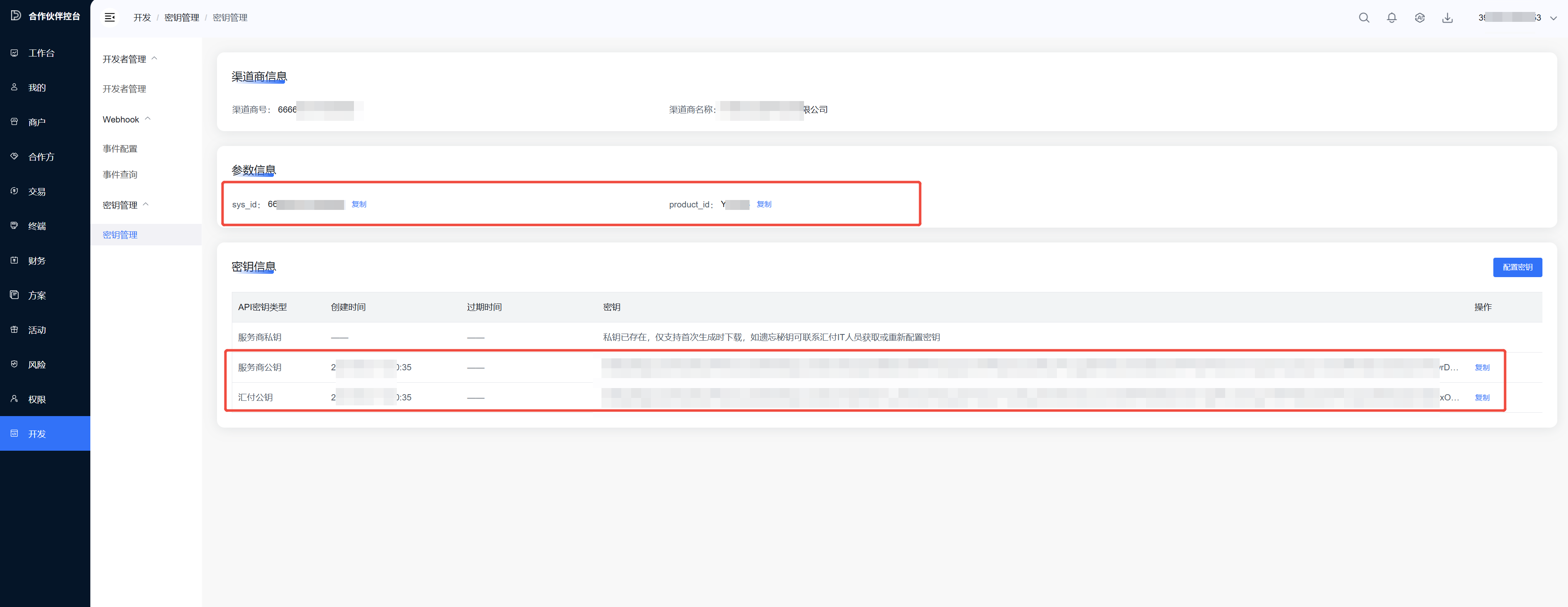 汇付公钥和服务商私钥对应公钥证书文件(在汇付服务商后台–开发中获取)、私钥证书文件(在生成的时候浏览器下载的文档中获取)。