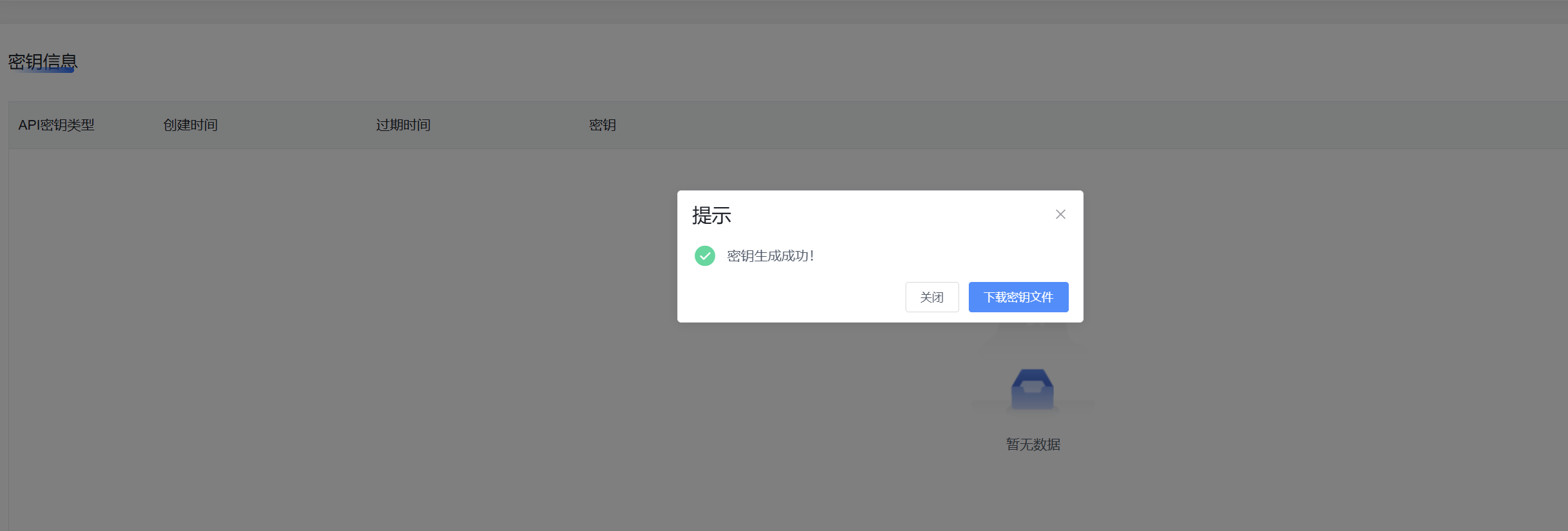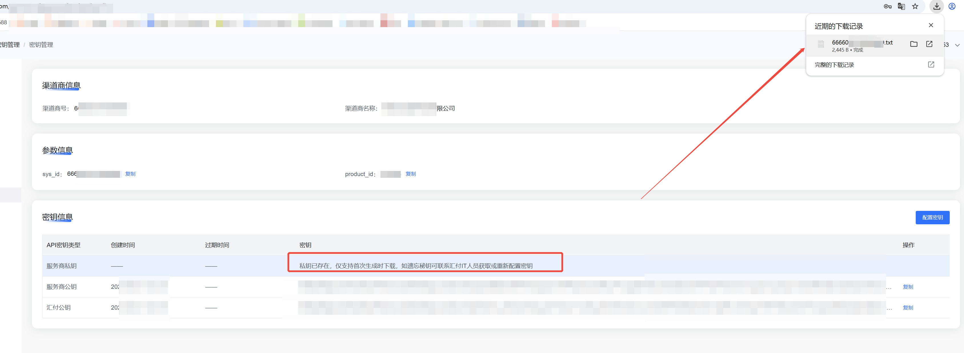 点击提交,成功生成密钥,可下载密钥文件,可在浏览器下载记录中查看。