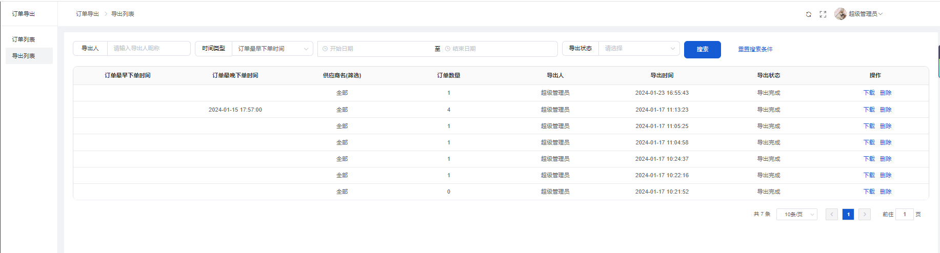 支持输入导出人、时间类型、导出状态搜索导出内容、删除导出的内容