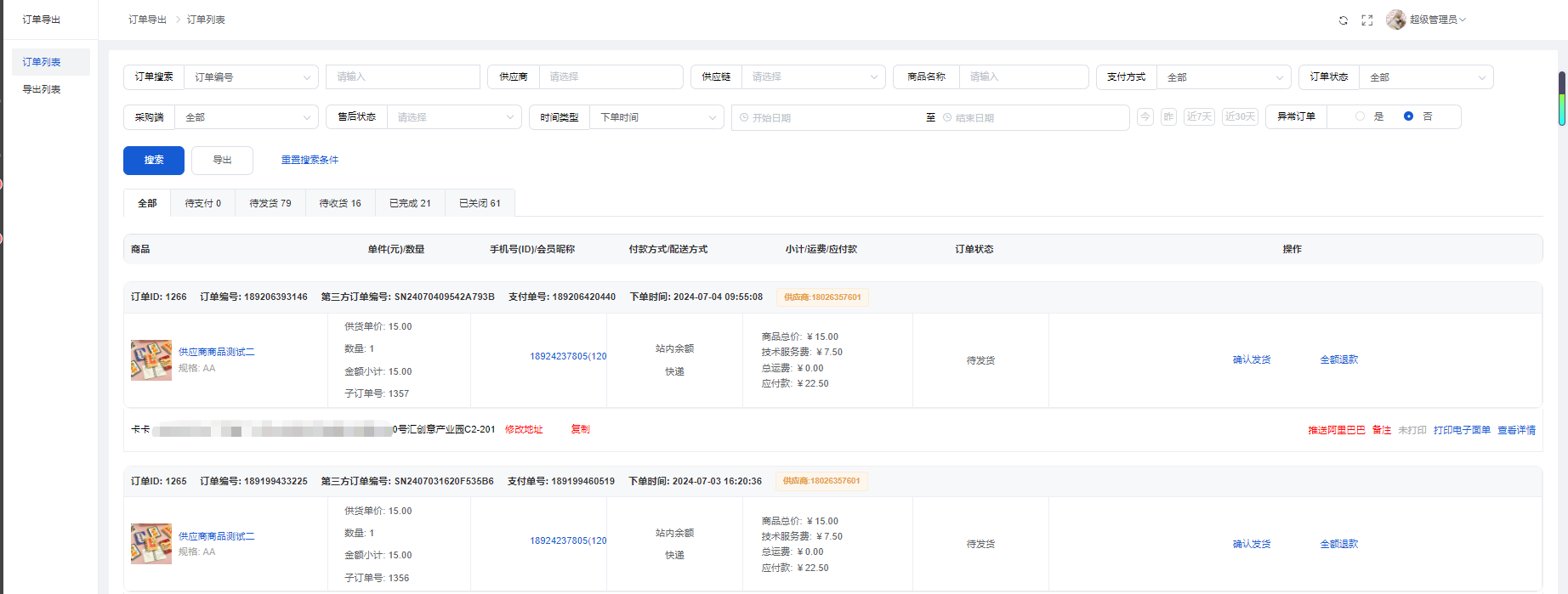 支持订单搜索、供应商、供应链、商品名称、支付方式、订单状态、采购端、售后状态、时间类型、异常订单进行筛选搜索订单导出