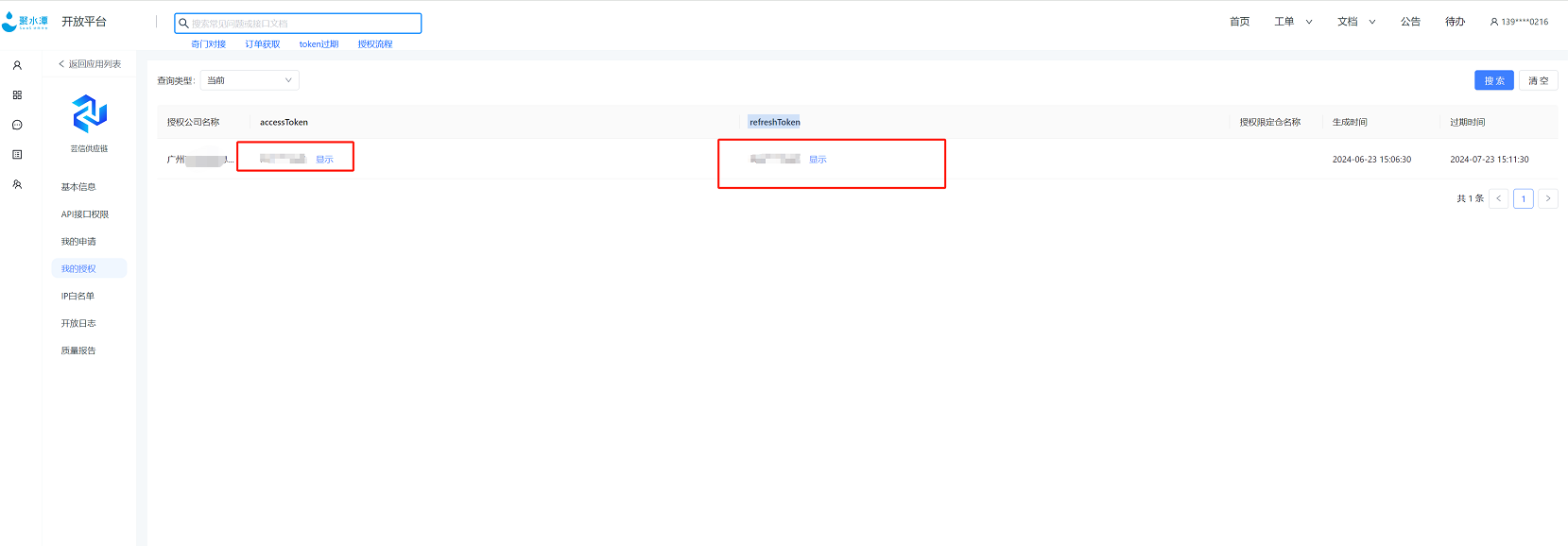 4、管理应用–应用–详情–我的授权–获取accessTokei、refreshToken