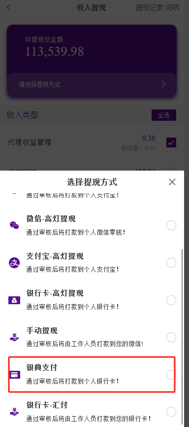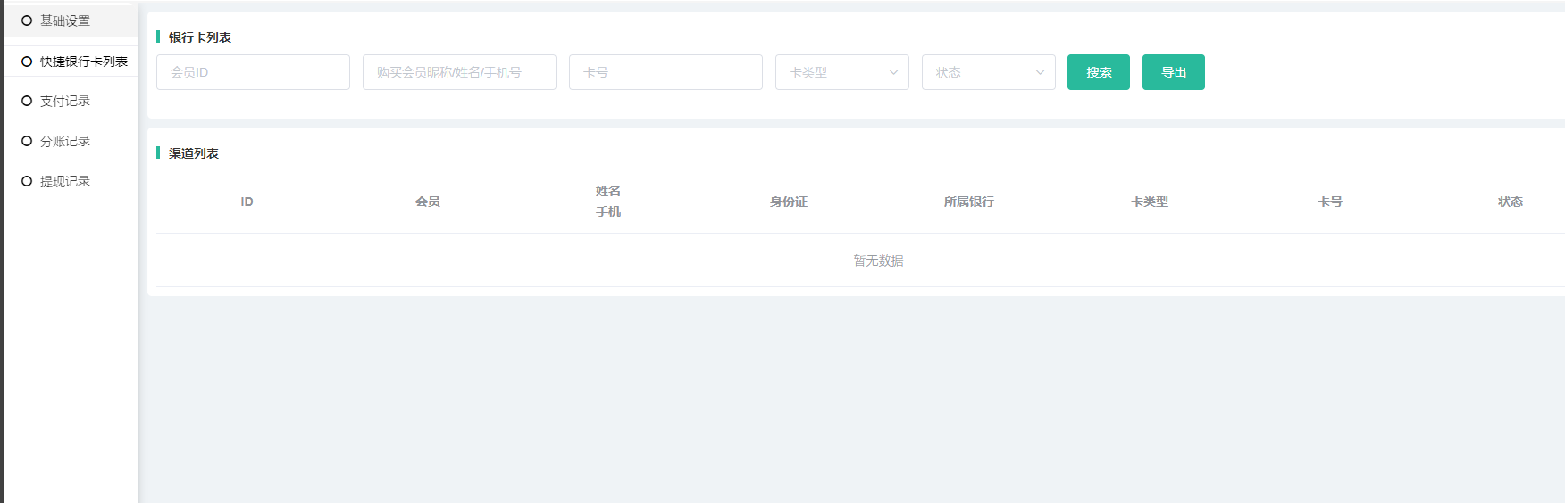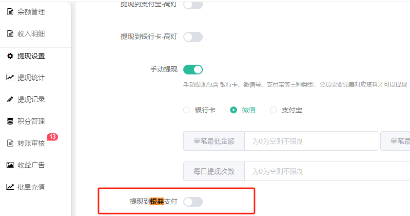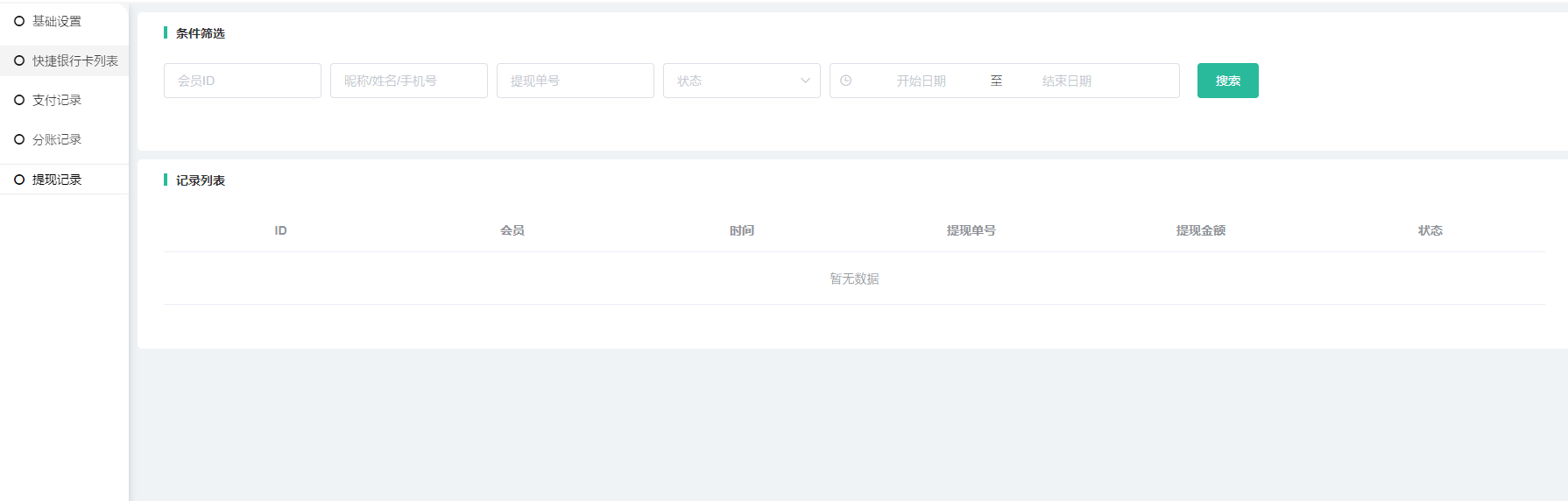 在财务–余额设置/收入提现设置开启银典支付提现按钮,前端用户提现选择提现到银典支付,这里会显示对应的提现记录(会员提现的银行卡对应会员中心–设置–银行卡所添加的卡号信息)