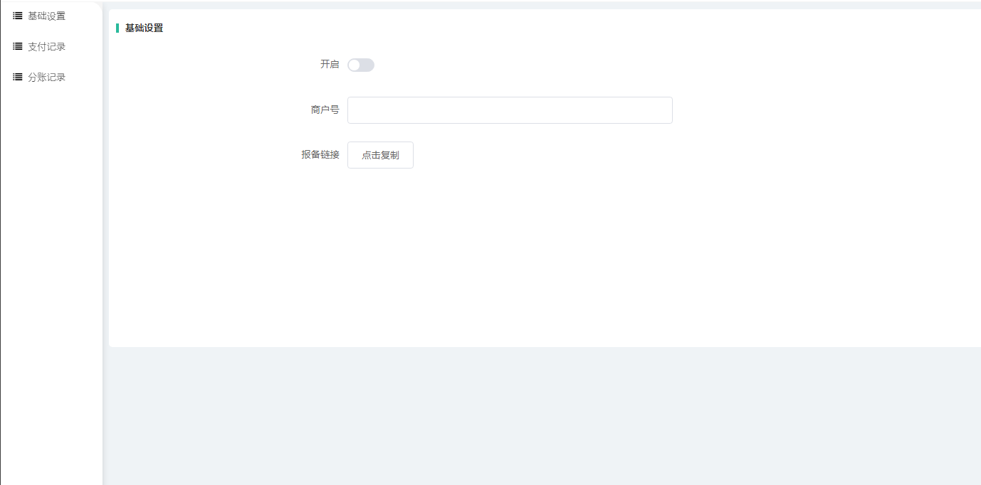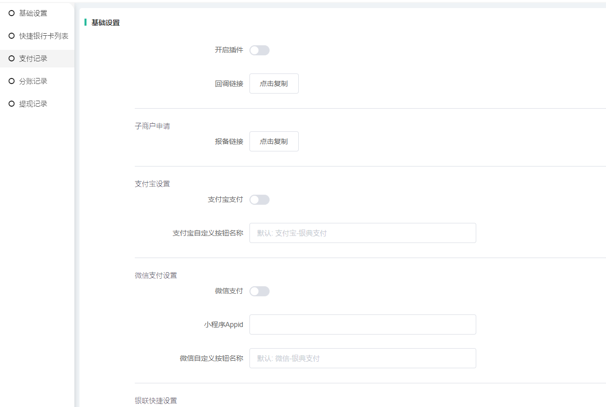 该页面的回调链接,子商户报备链接,商户设置都需要找第三方银典配置获取填写后台