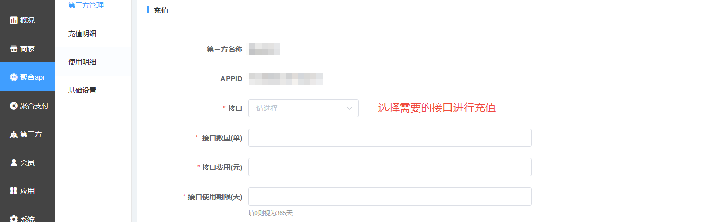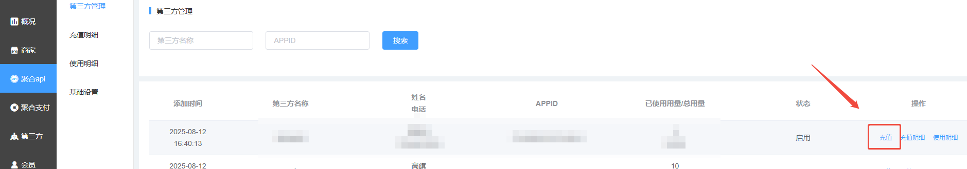 同步第三方对接插件中所添加的第三方客户信息(如商城),可以在列表对相应第三方进行充值(根据需要的接口进行充值)