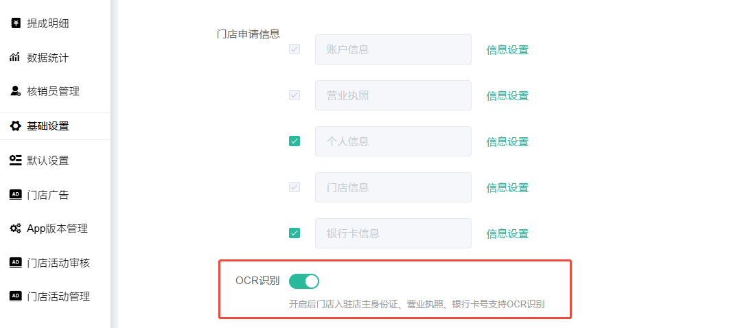 不需要单独选择接口通道,配置好数据通系统对接插件即可。配置后,门店-收银台插件-基础设置,开启OCR识别,开启后门店入驻店主身份证、营业执照、银行卡号支持OCR识别