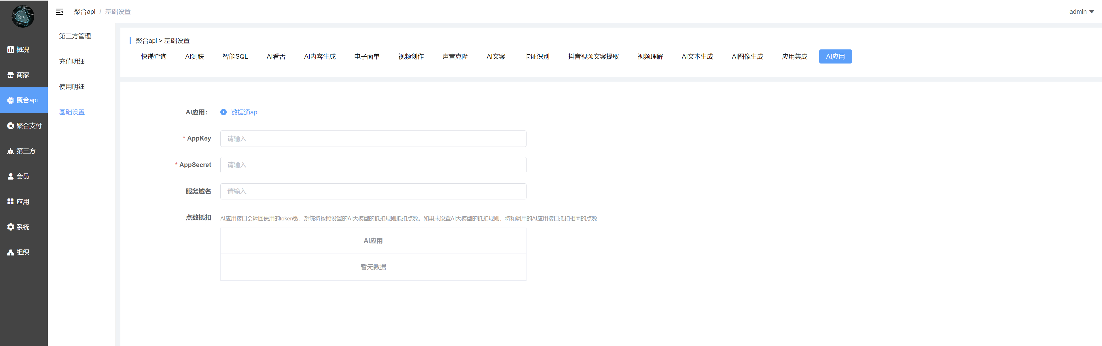 商城–应用–AI看舌–基础设置,选择数据通,单独配置appkey和appsecret