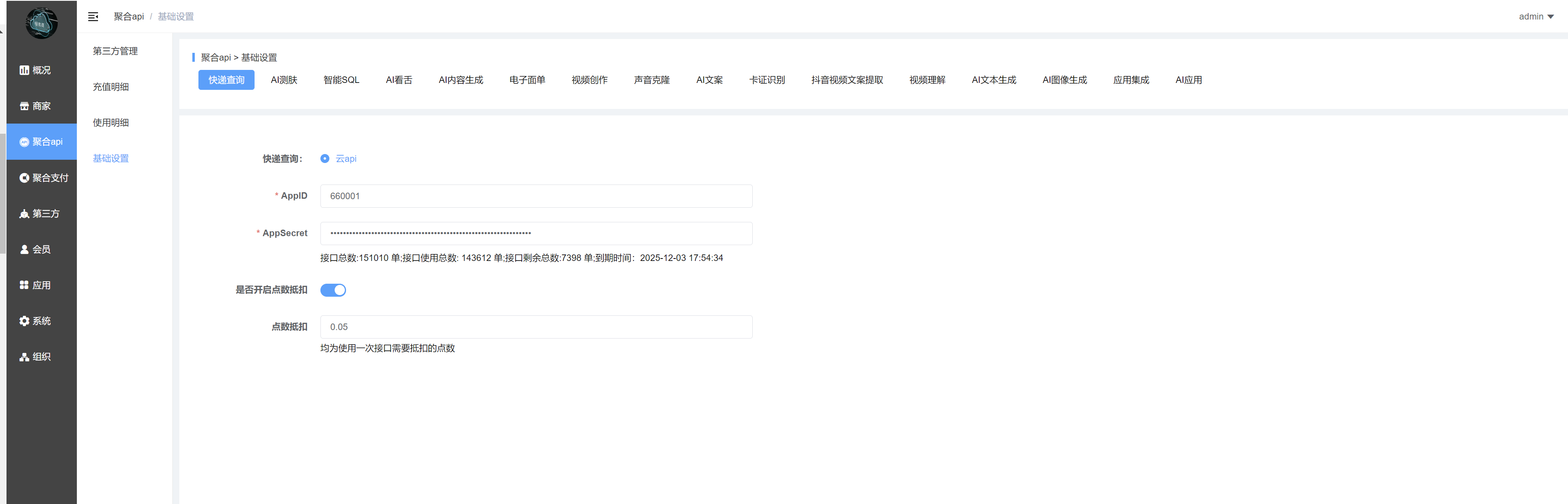 提供快递查询、AI测肤、智能SQL、AI看舌、AI内容生成、电子面单、视频创作、声音克隆、AI文案、卡证识别、视频理解、AI文本生成、AI图像生成、应用集成、AI应用等API分发能力;