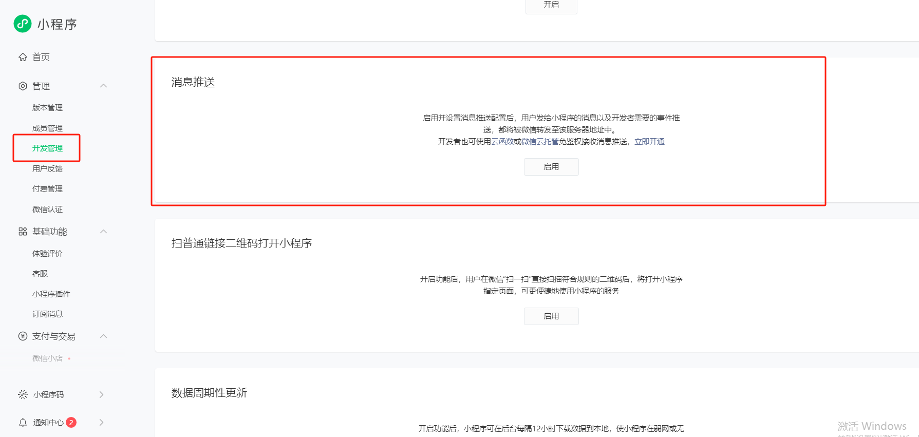 三、注意需要配置小程序平台(https://mp.weixin.qq.com)–开发管理–开发设置–消息推送;