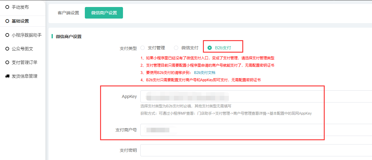 4、B2b支付只需要配置支付商户号和AppKey即可支付,无需配置密钥证书