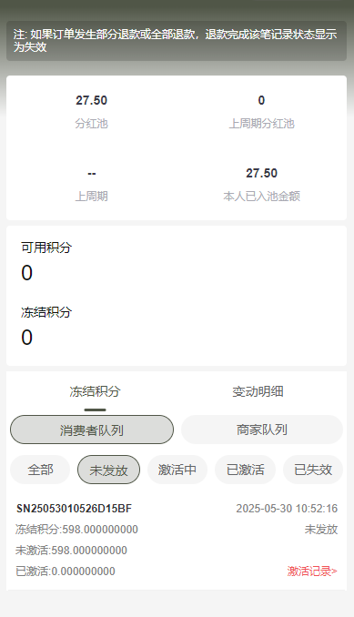 商家前100位订单每日补贴,获得30%(价值1.26积分),前100个订单均分,平均解冻:0.0126积分,前100个订单只跟消费时问顺序有关,收银台,门店商品,供应链商品订单,某商家冻结积分不足时,超过部分激活部分,投入到加权每日积分池中