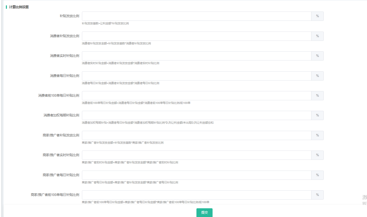 由运营中心关系链团队第二个运营中心开始,订单金额*让利比例*补贴发放比例*商家/推广者团队补贴发放比例*商家/推广者实时补贴比例*推广者团队实时补贴管理补贴比例