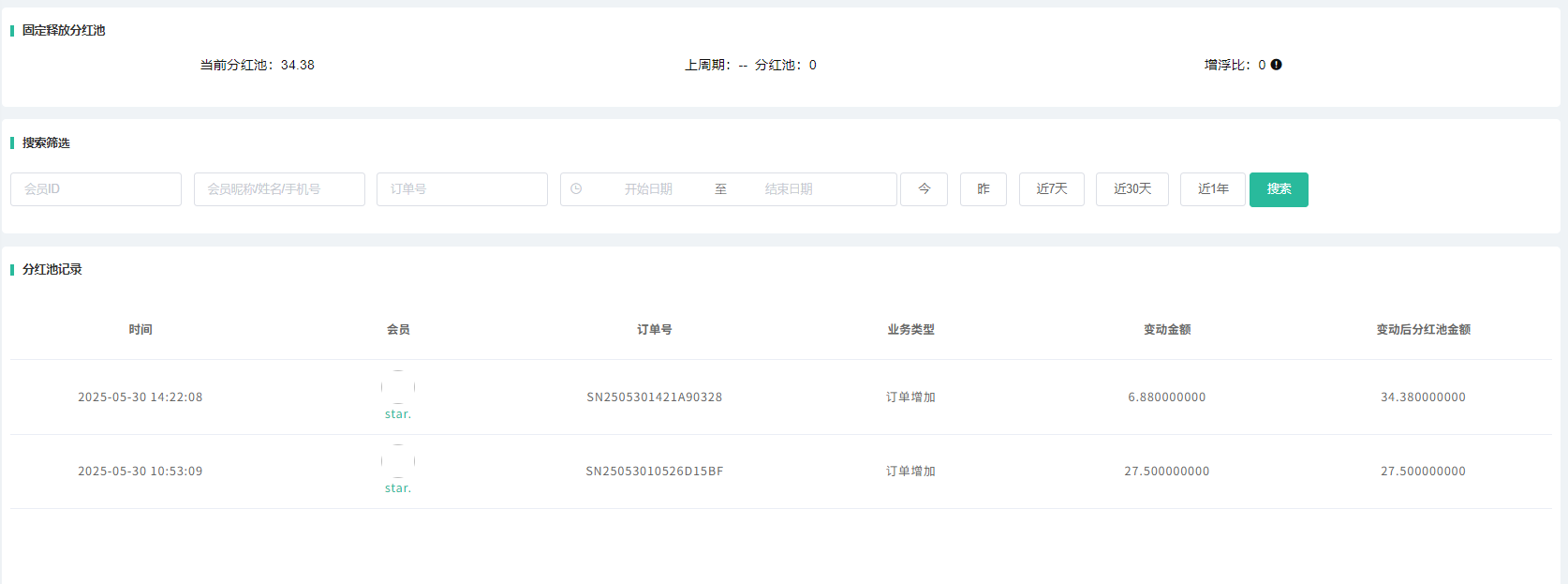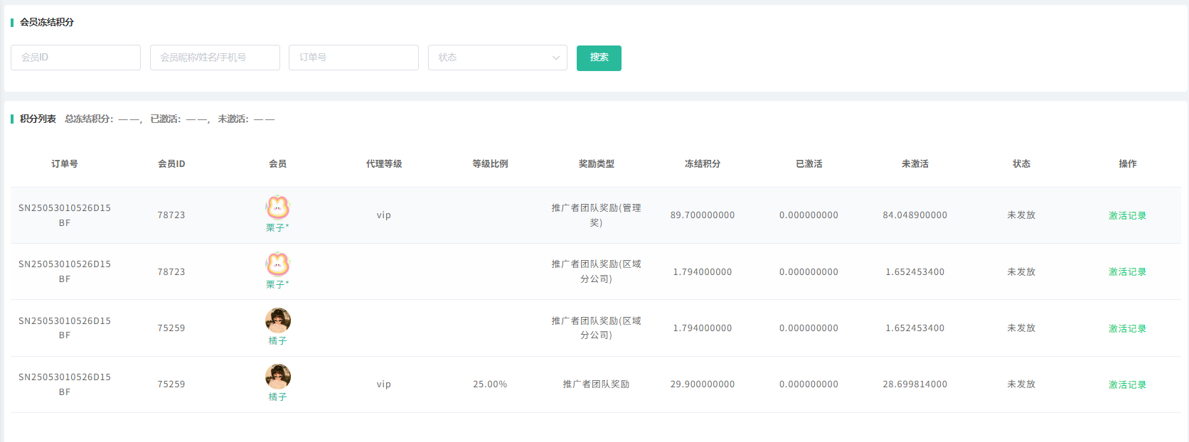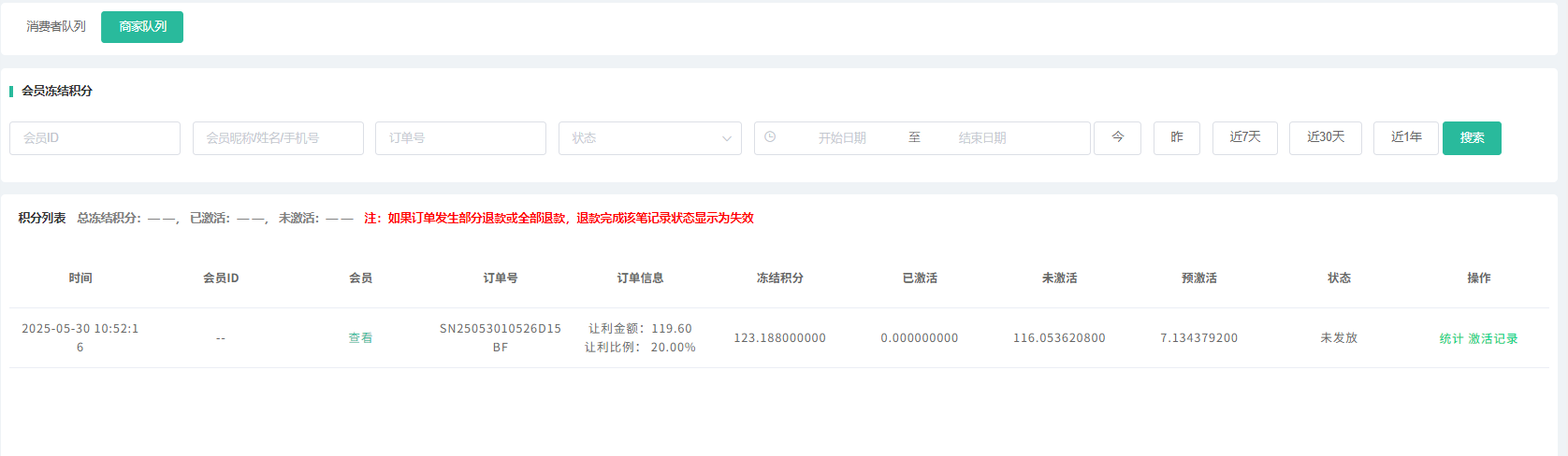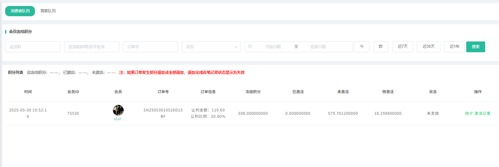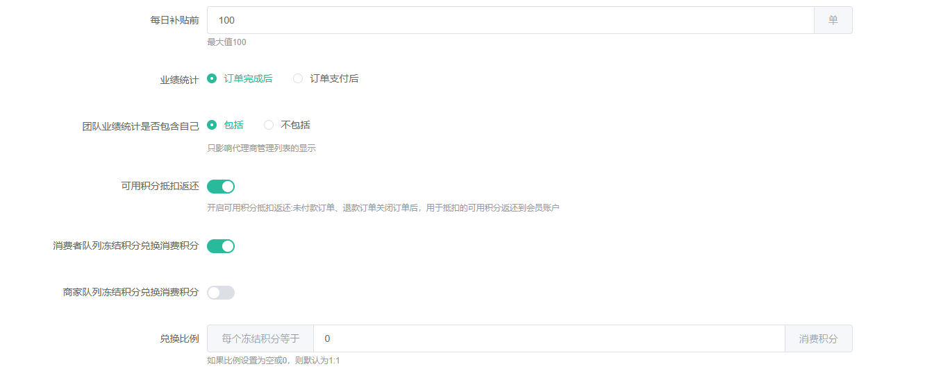 6)门店商家获得倍数:门店店长可以获取X倍的冻结积分(这个是针对收银台订单的,门店线上商品-商家队列是看推广者团队获得倍数)