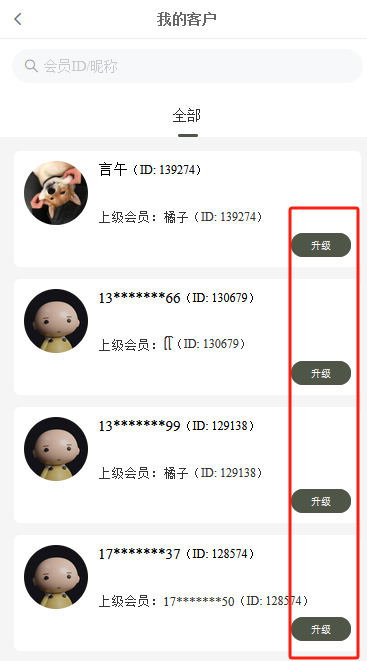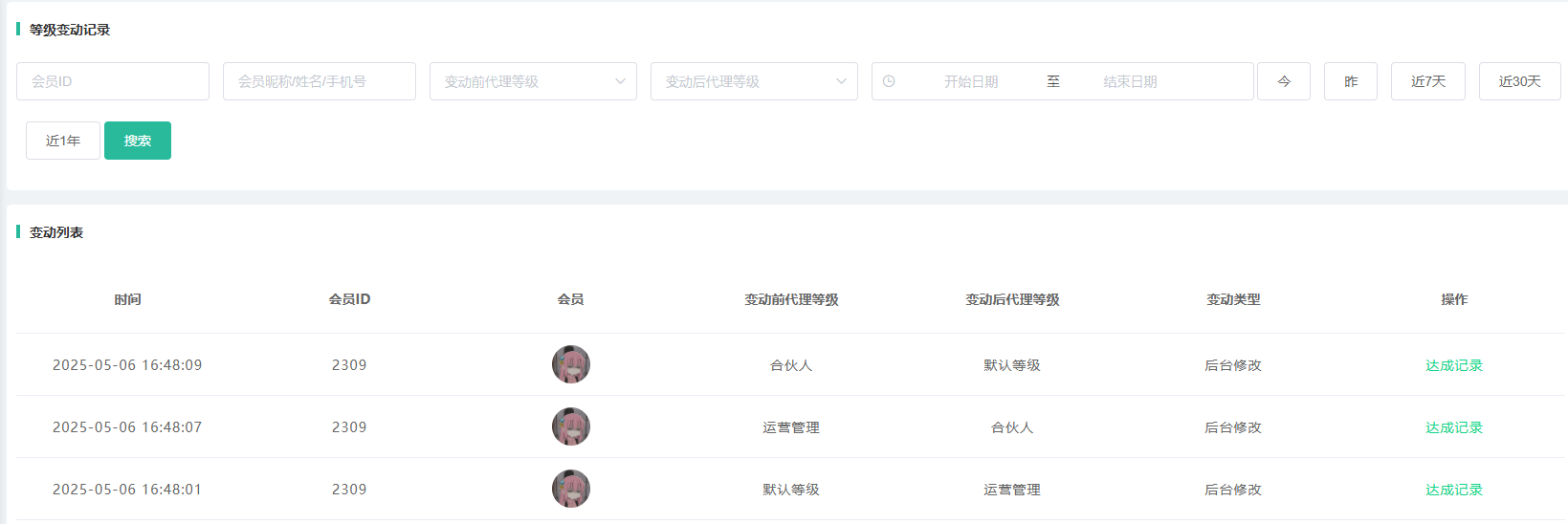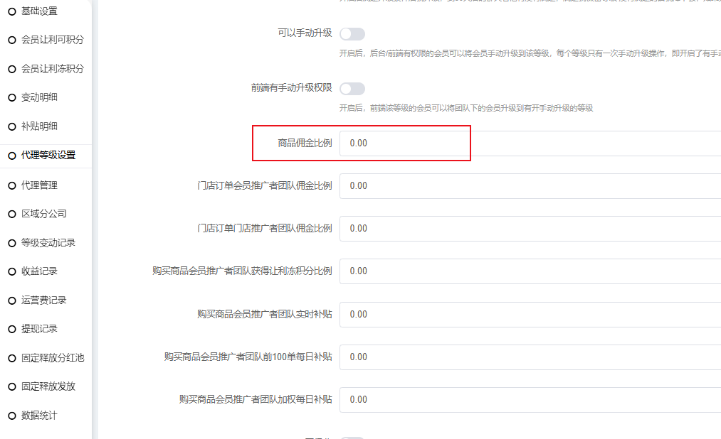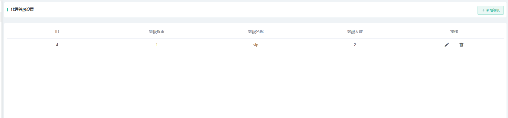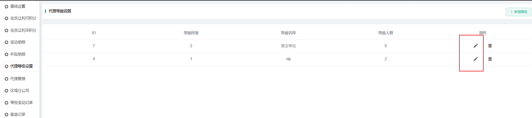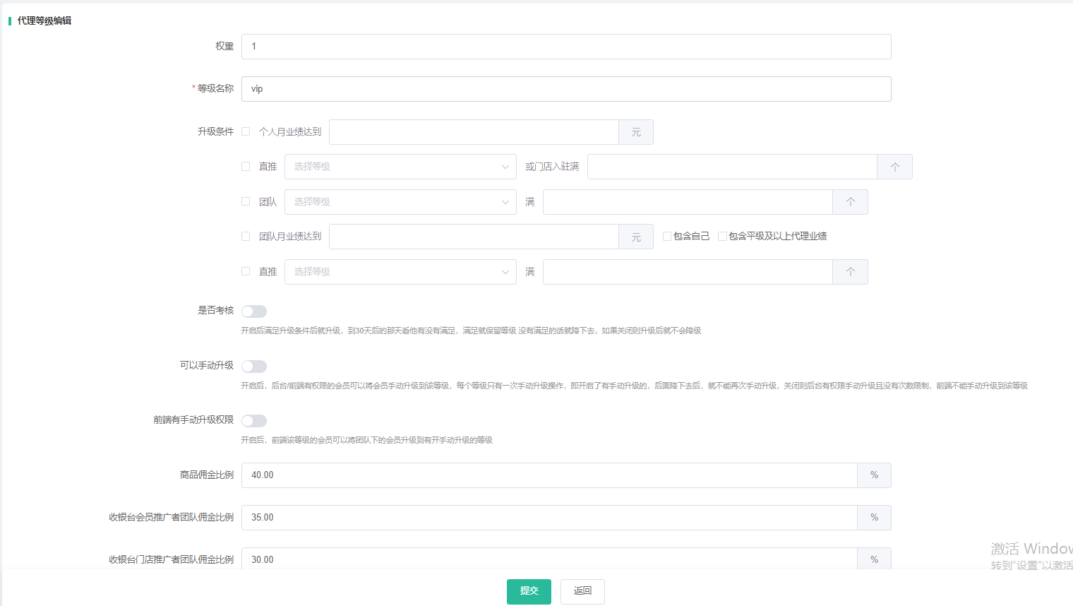 2、后台插件-代理等级设置 如果开启了可以手动升级和前端有手动升级权限 则可以对下级进行升级等级