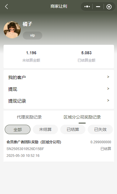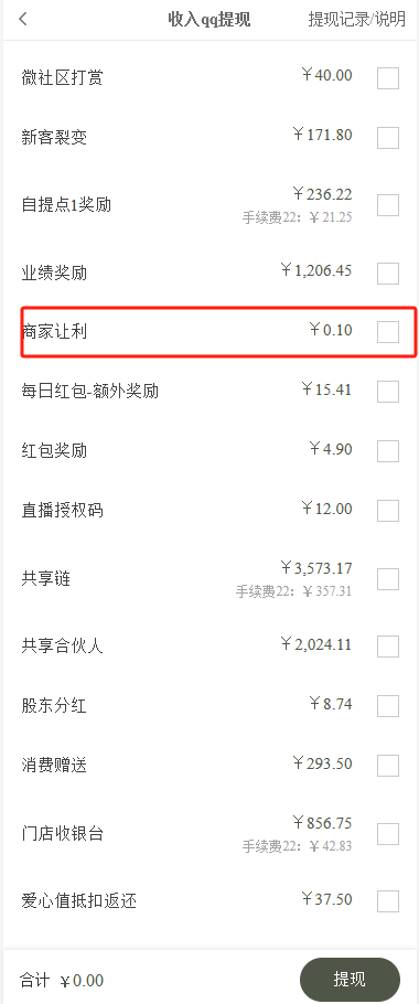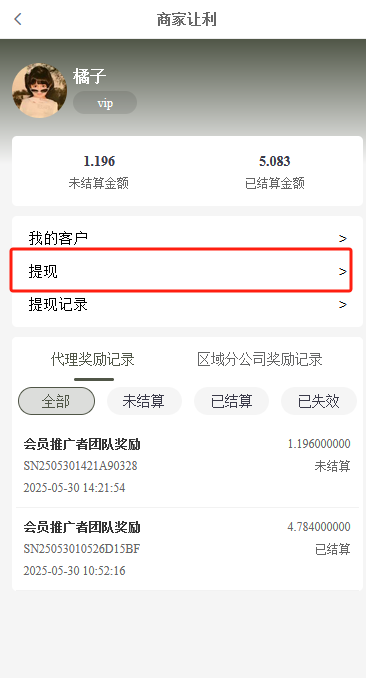 用户在推广中心–商家让利进行提现,可以自定义输入提现数额,提现后到收入中,再到收入提现中去进行提现即可·