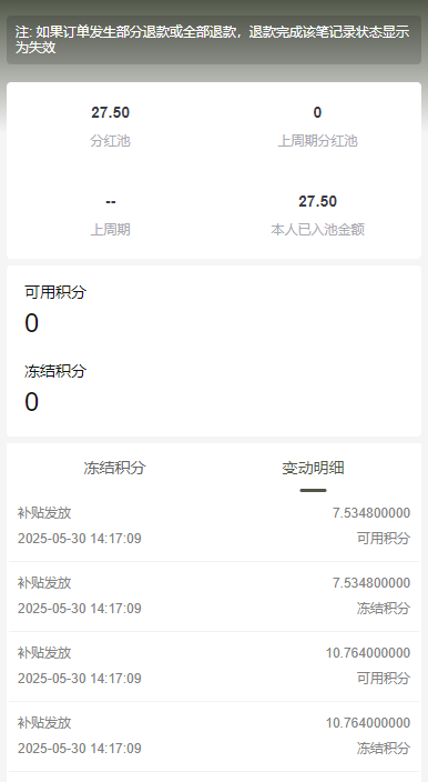 订单退款-订单产生的队列失效(如果队列处于发放中状态,还需要把发出去的冻结积分扣除回来,剩多少扣回多少)-订单产生的补贴全部失效(把补贴所扣除的各自队列的未激活积分返还到各自队列的未激活积分中)