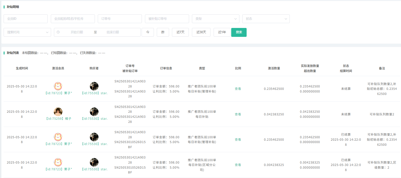 1、展示推广者和消费者所有的补贴明细(点击比例查看可以查看到相关的比例,套用公式进行计算)