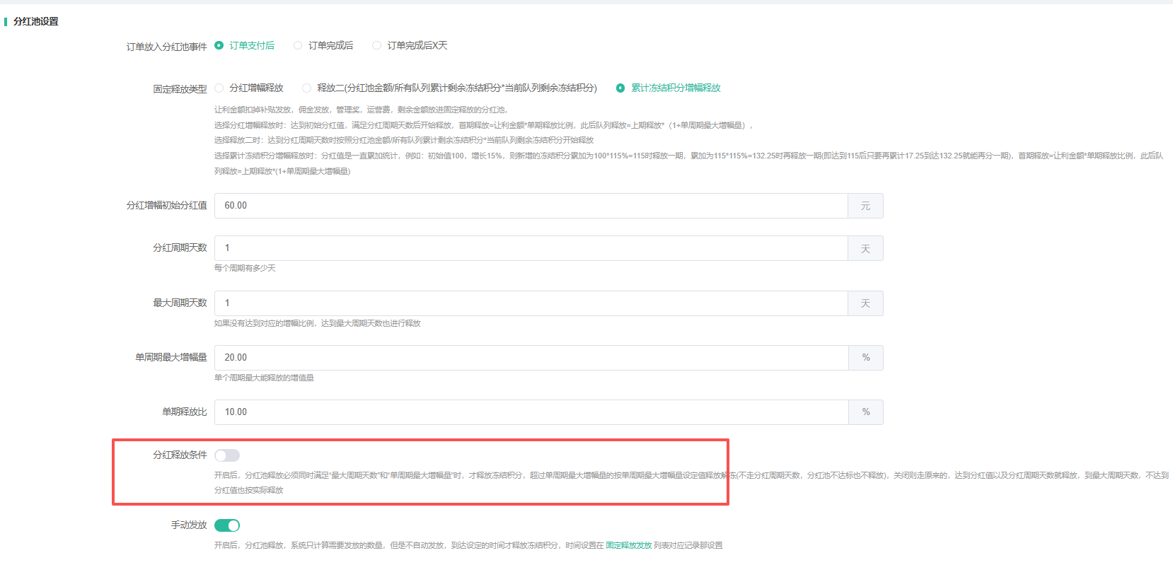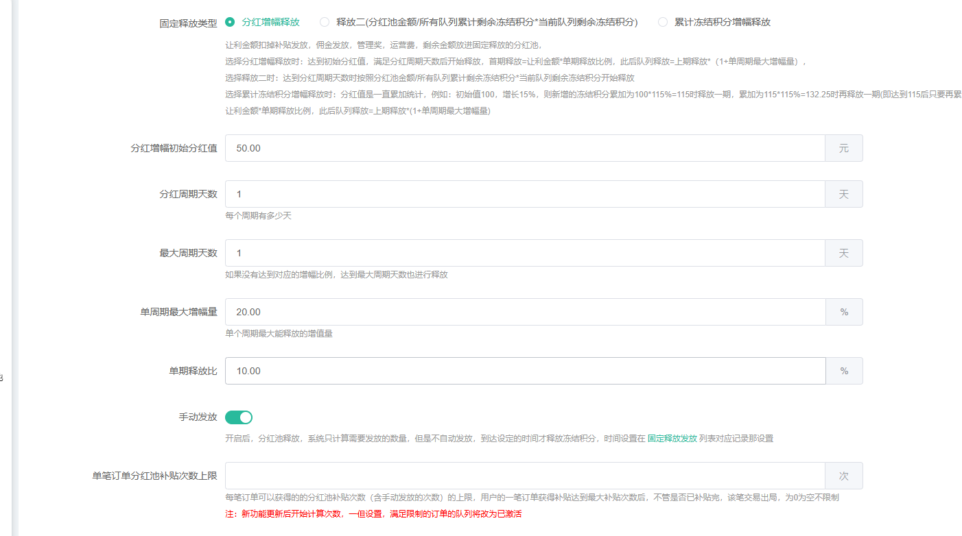 分红值是一直累加统计,例如:初始值100,增长15%,则新增的冻结积分累加为100*115%=115时释放一期,累加为115*115%=132.25时再释放一期(即达到115后只要再累计17.25到达132.25就能再分一期)
