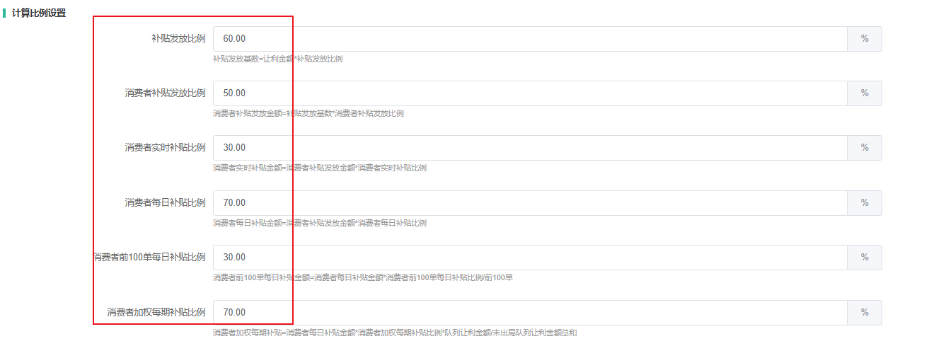 (让利金额 * 补贴比例 * 商家/推广者团队补贴发放比例 * 商家/推广者每日补贴比例 * 商家/推广者前100单每日补贴比例)/ 可补贴的队列数量* 推广者团队前100单每日团队补贴比例 * 扣除极差后推广者前100单每日补贴比例*平级奖比例