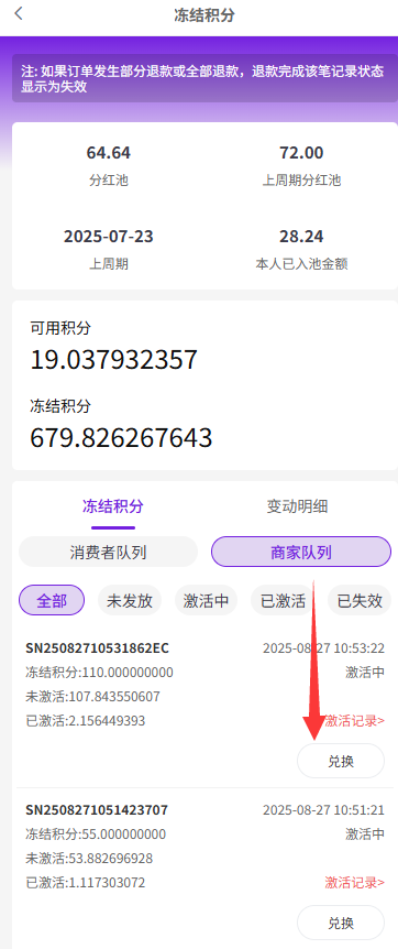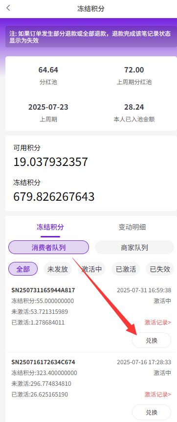 13)消费者队列冻结积分兑换消费积分:开启后在前端–会员中心–商家让利–消费者队列里显示兑换按钮