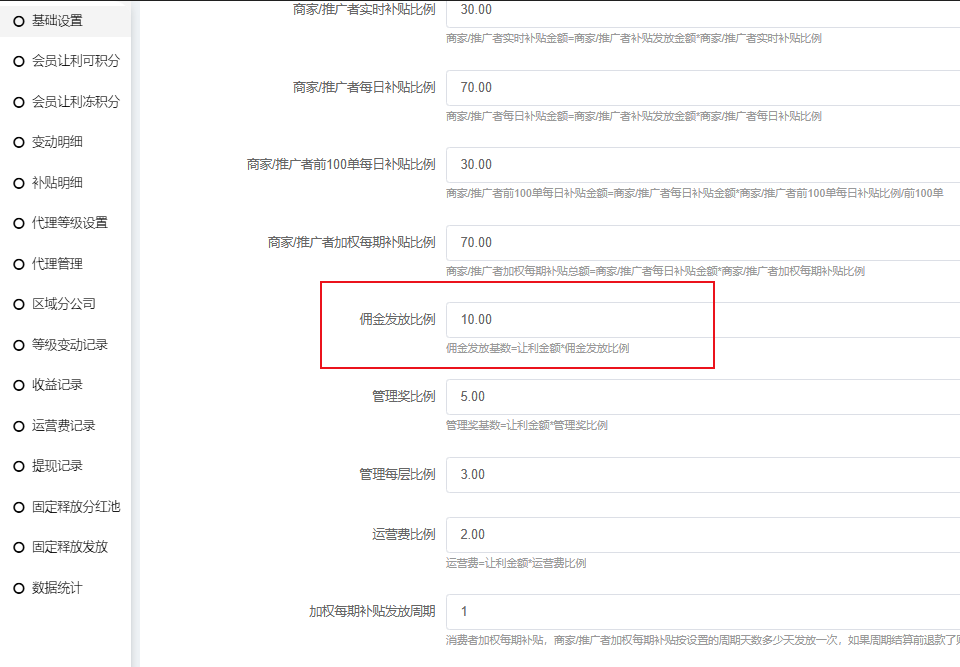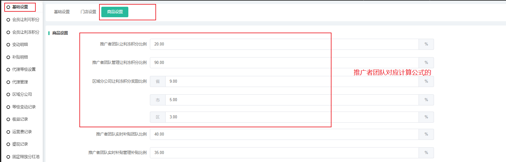 公式:让利金额*佣金发放比例*会员推⼴者团队佣⾦⽐例*区域分公司(区级)佣金发放比例