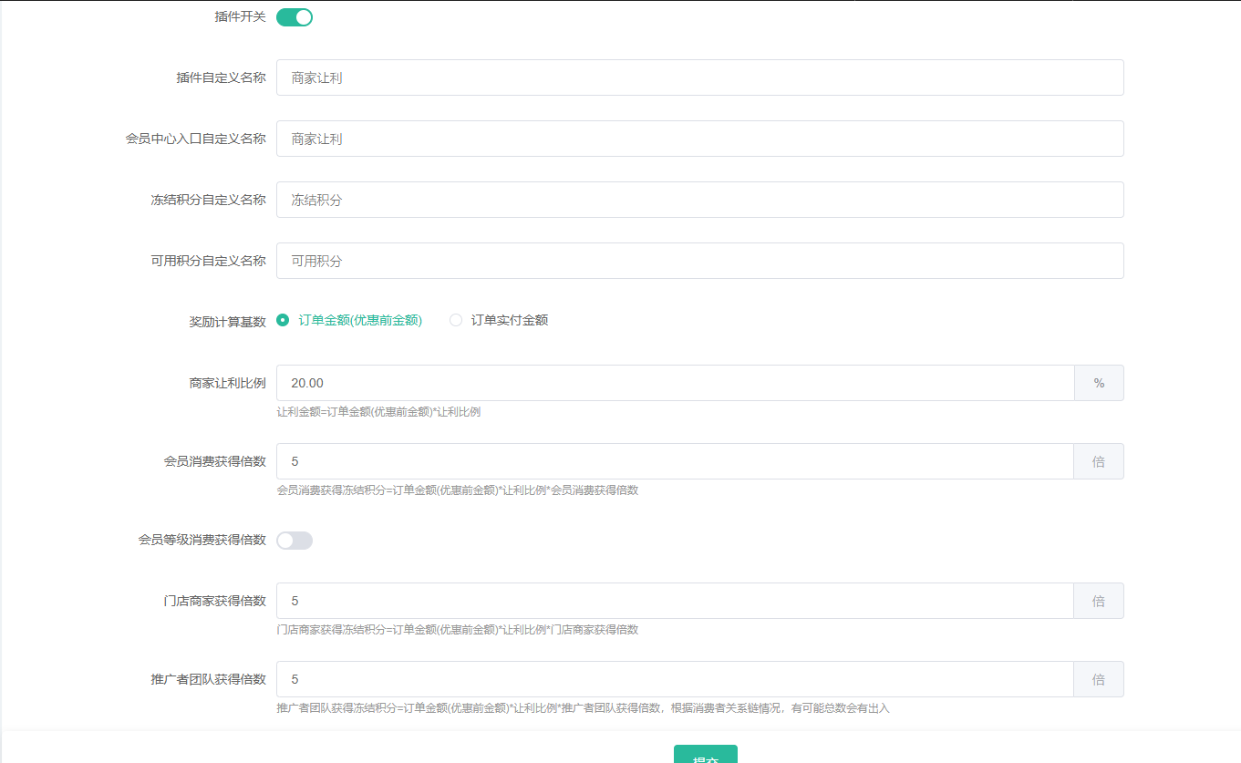 门店商家获得冻结积分公式=门店订单让利金额(即订单原价 或 订单实付金额 * 平台提成比例)*门店商家获得倍数