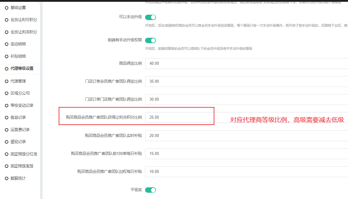 公式:让利金额*佣金发放比例*门店推广者团队佣金比例*扣除极差后门店推广者团队佣金比例*等级平级奖比例