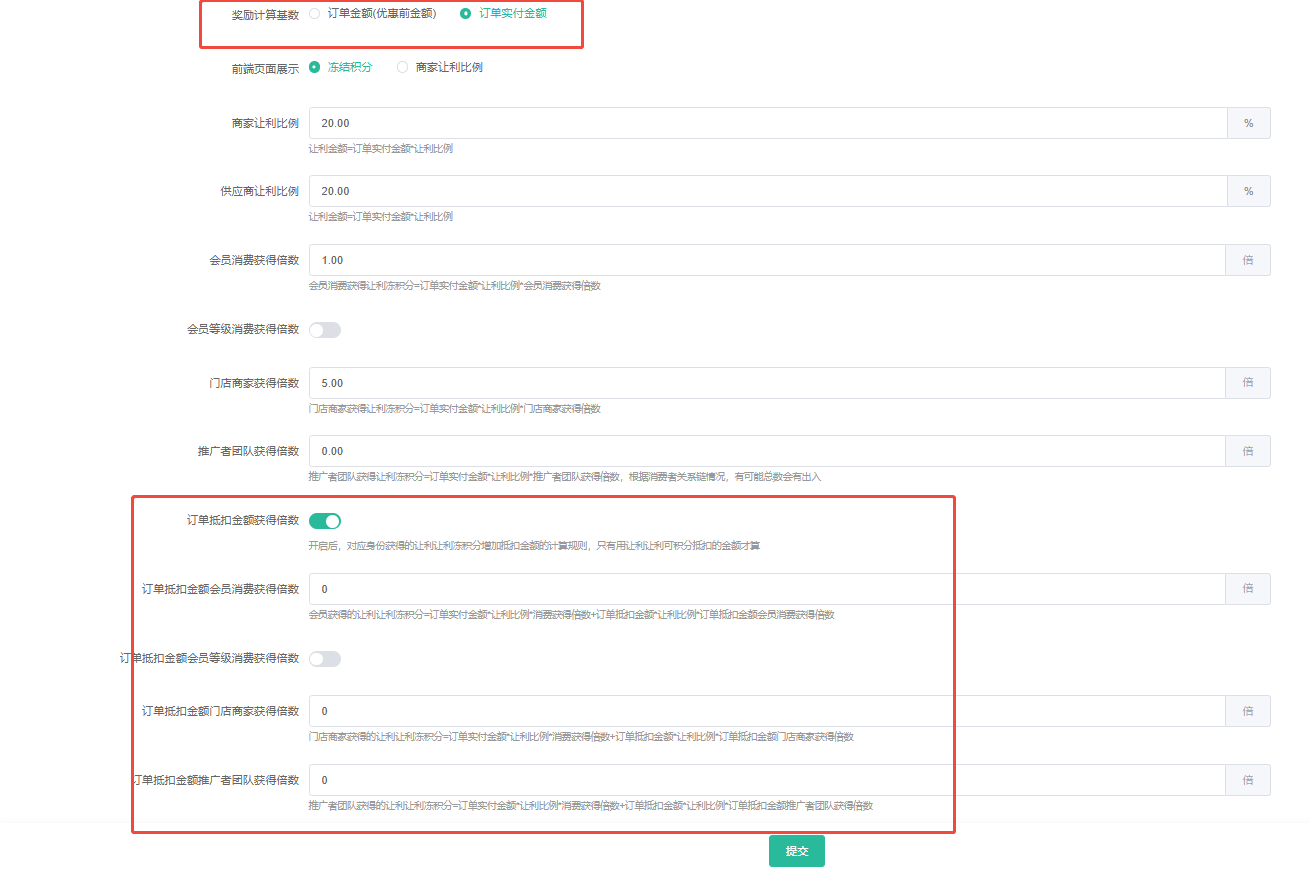8)订单抵扣金额获得倍数(当奖励计算基数选择订单实付金额显示该开关)