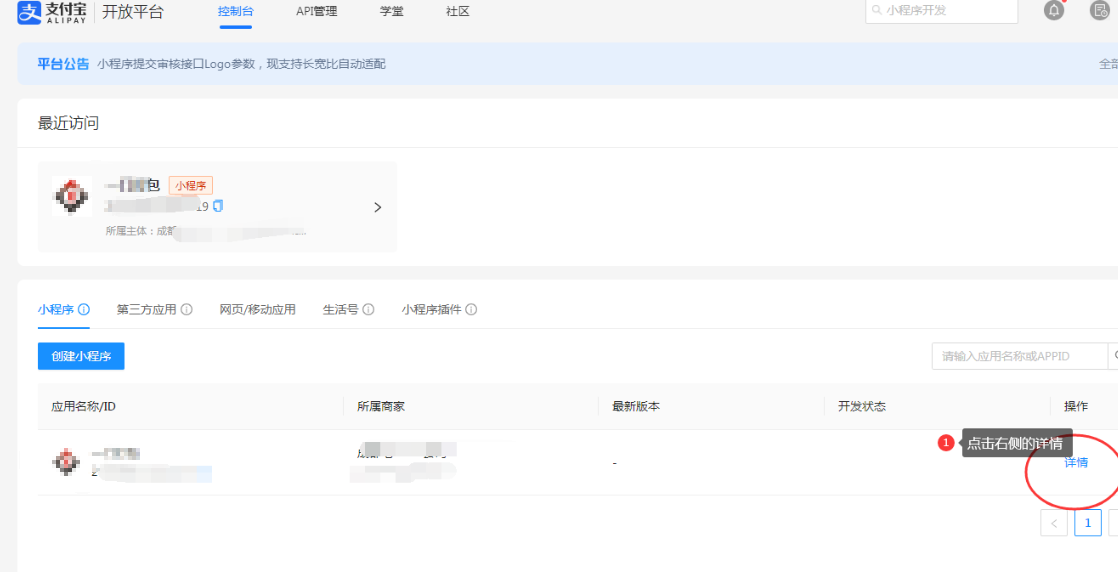 登录支付宝开放平台(https://open.alipay.com/develop/manage),进入小程序管理