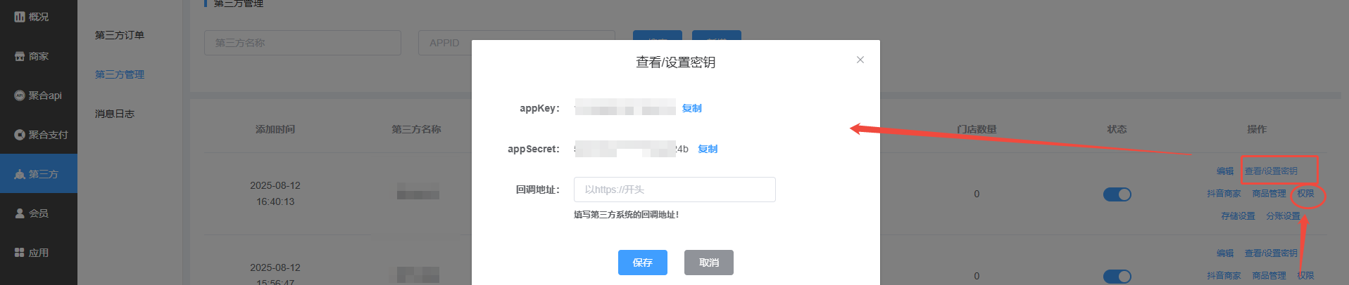 第三方添加后,在列表中即可获取对接的密钥信息;同时注意点击权限勾选需要的权限(例如门店/聚合支付)
