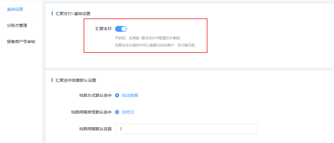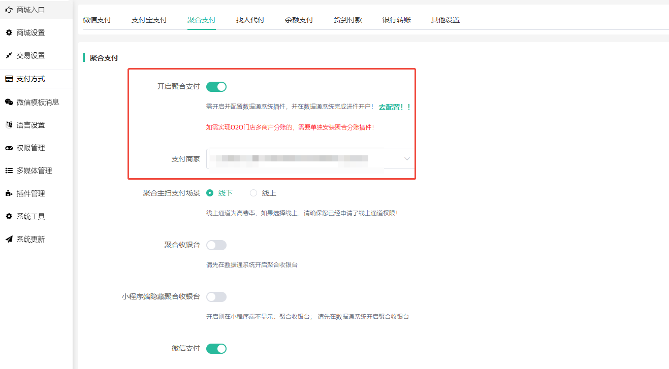 (应用–汇聚支付插件中)开启按钮后,到应用–商家–聚合支付中配置支付参数;