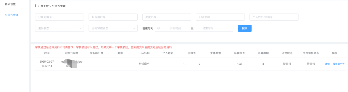 提交进件后,在汇聚支付–分账方管理中可查看进件审核状态