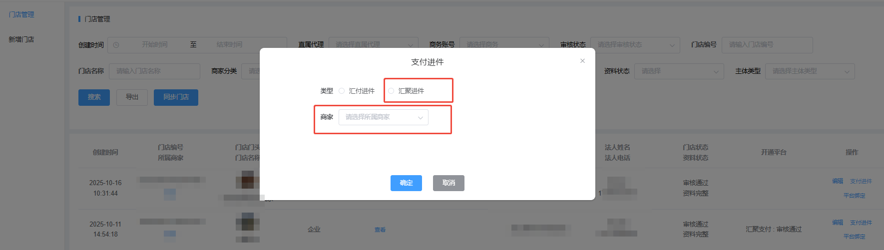 添加完门店后,在门店管理列表–操作–支付进件,可提交门店进件第三方支付平台的商户或者分账方,目前支持汇聚支付分账方进件。