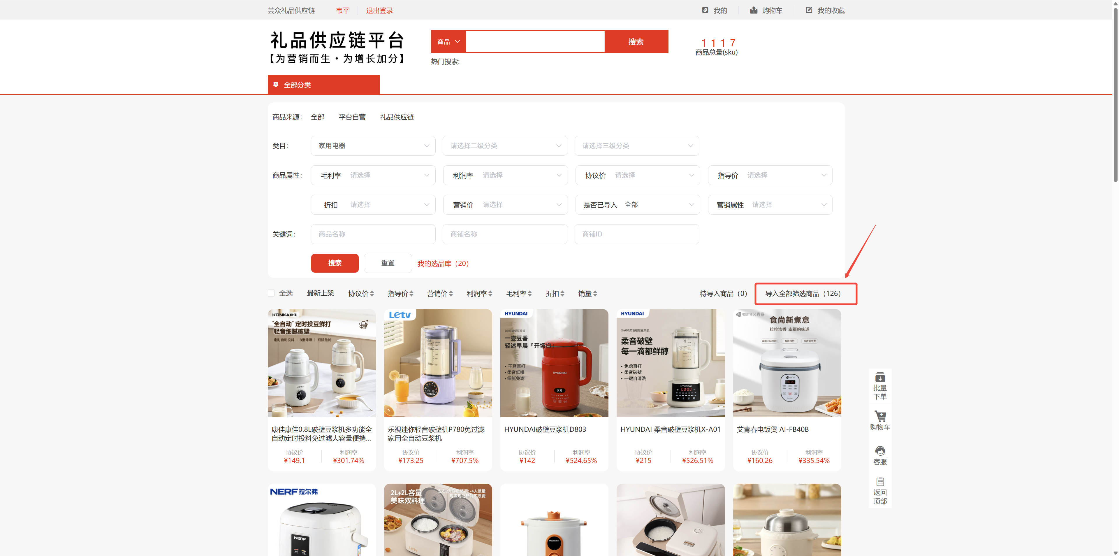 筛选后,可点击导入全部筛选商品将搜索筛选的商品加入选品库。