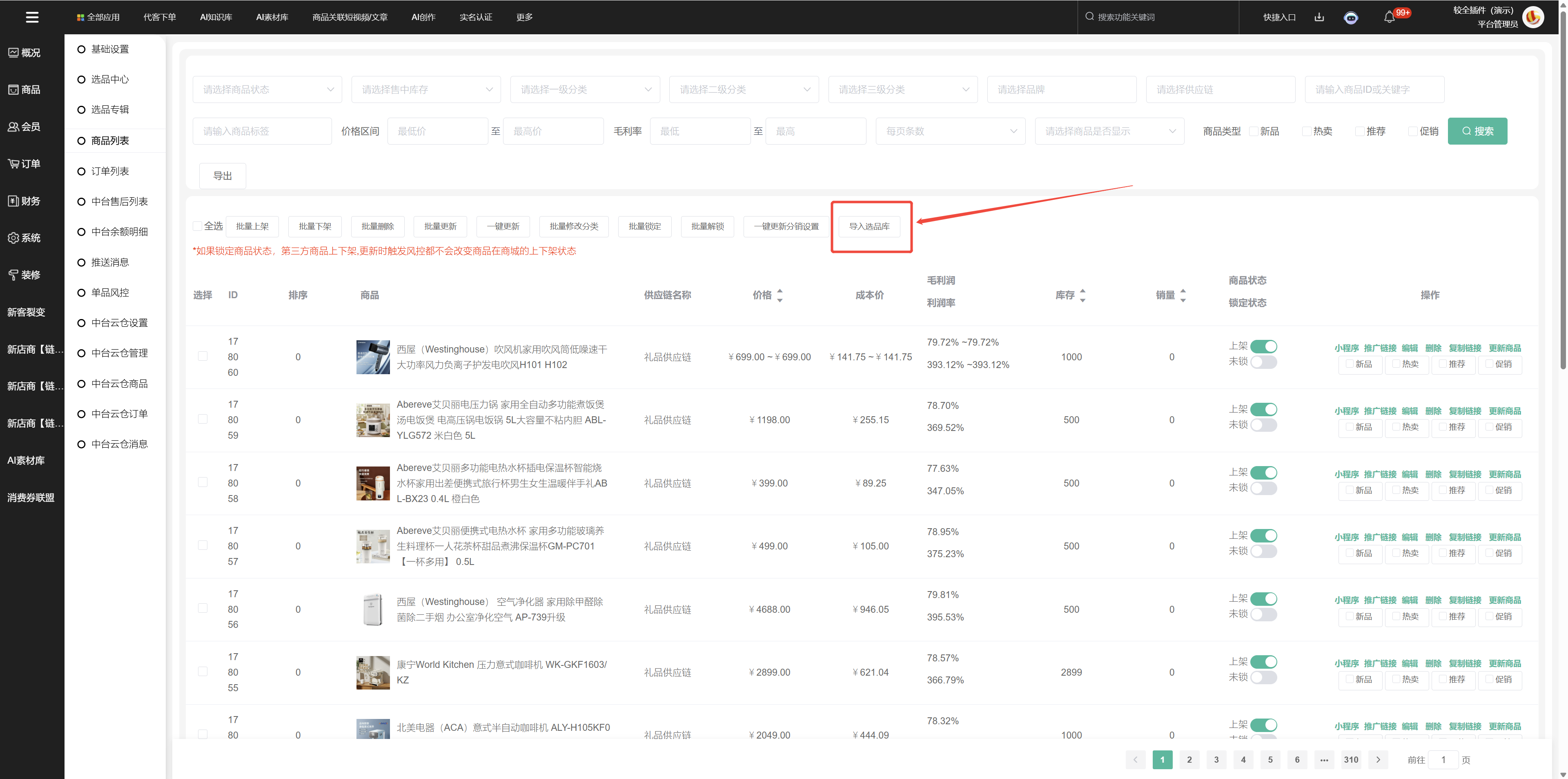 在礼品供应链平台选品加入选品库后,可通过商城供应链–商品列表,一键导入选品库商品;