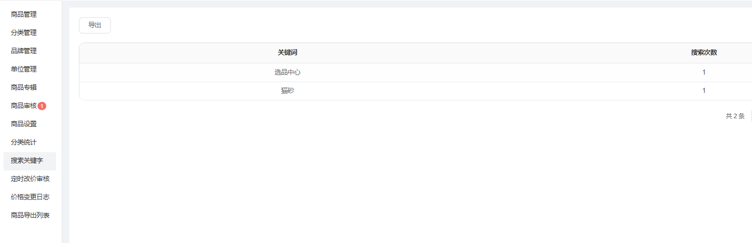 4.1搜索关键词作者: aishidai / 2025年11月21日 用户在搜索框搜索关键词,后台这里有条搜索记录,展示搜索的关键词和搜索次数 广州市芸众信息科技有限公司 广州市白云区机场路1600号汇创意产业园C2栋 备案号:粤ICP备17018310号-1 粤公网安备 44011102002664号