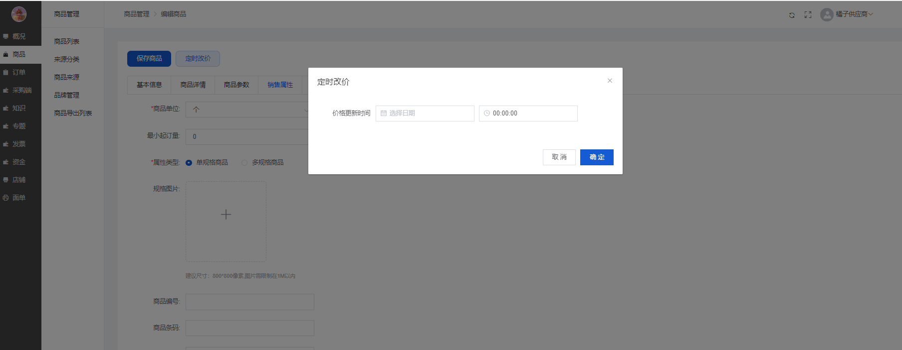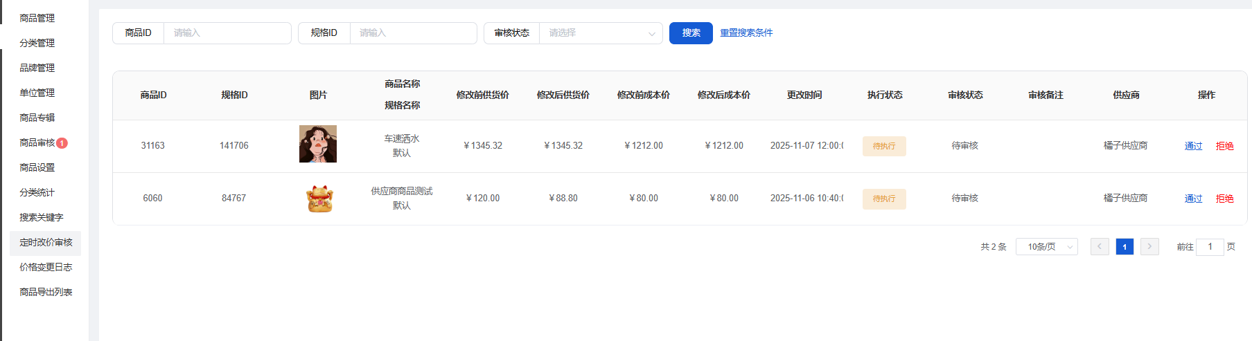 4.2定时改价审核作者: aishidai / 2025年11月21日 供应商预设价格生效时间,系统将在指定时间自动更新前端展示,避免浏览/下单过程中的价格波动引发投诉 供应商–基础设置–商品发布设置,有个公用供货价公式(选择不可以的情况下才会显示) 供应商发布商品–定时改价后会按照该公式进行改价