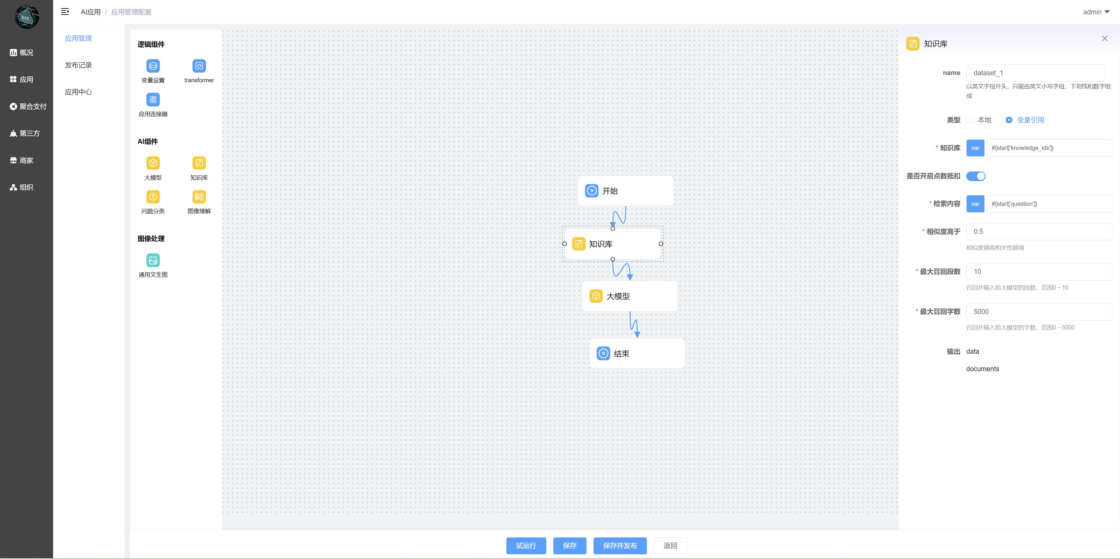 逻辑组件:变量设置、transformer、应用连接器(调用应用集成插件中的应用连接器);