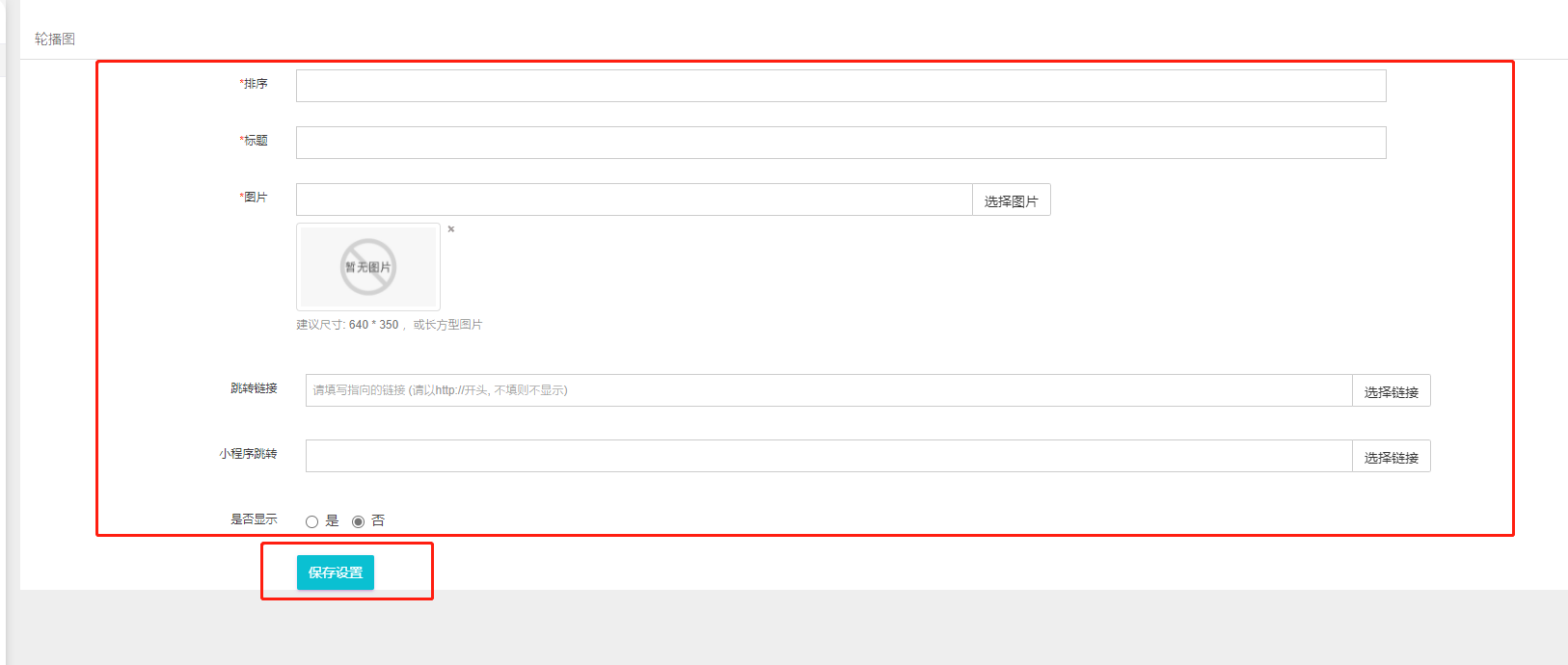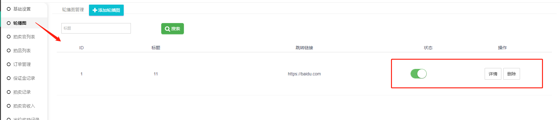 1,轮播图列表,显示在拍卖聚合页(也可以在前端会员中心-拍卖 进入查看)顶部,可以添加多个轮播图,列表管理轮播图是否显示,查看详情即操作删除
