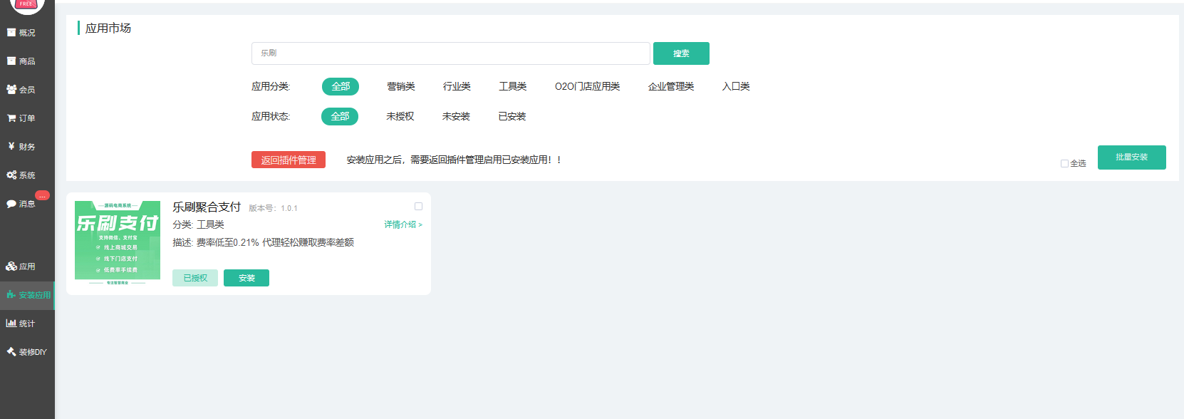安装路径:总后台 — 安装应用 — 搜索“乐刷聚合支付”并安装