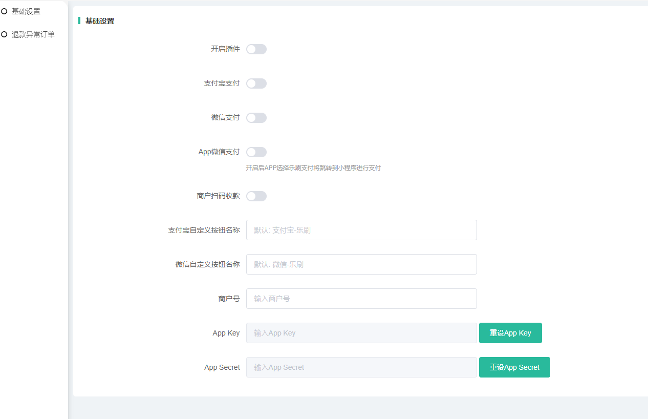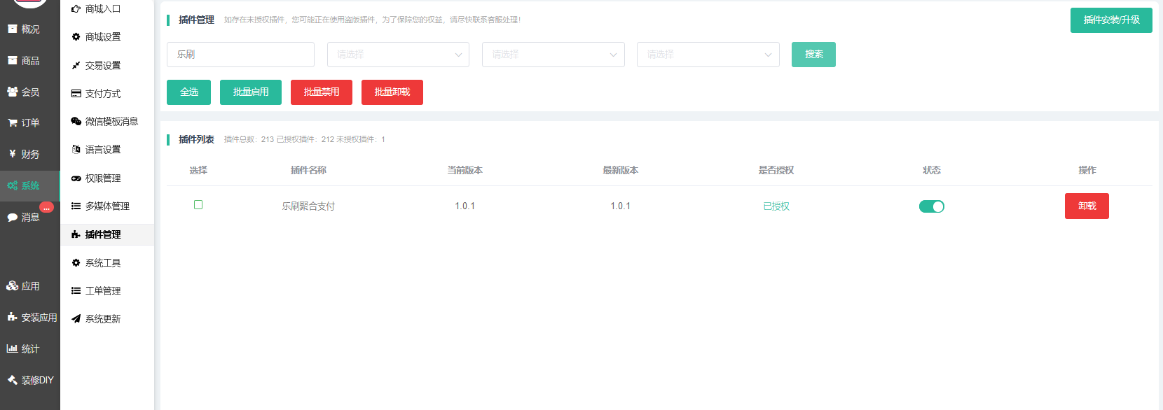 启用路径:总后台 — 系统 — 插件管理 –启用“乐刷聚合支付”插件
