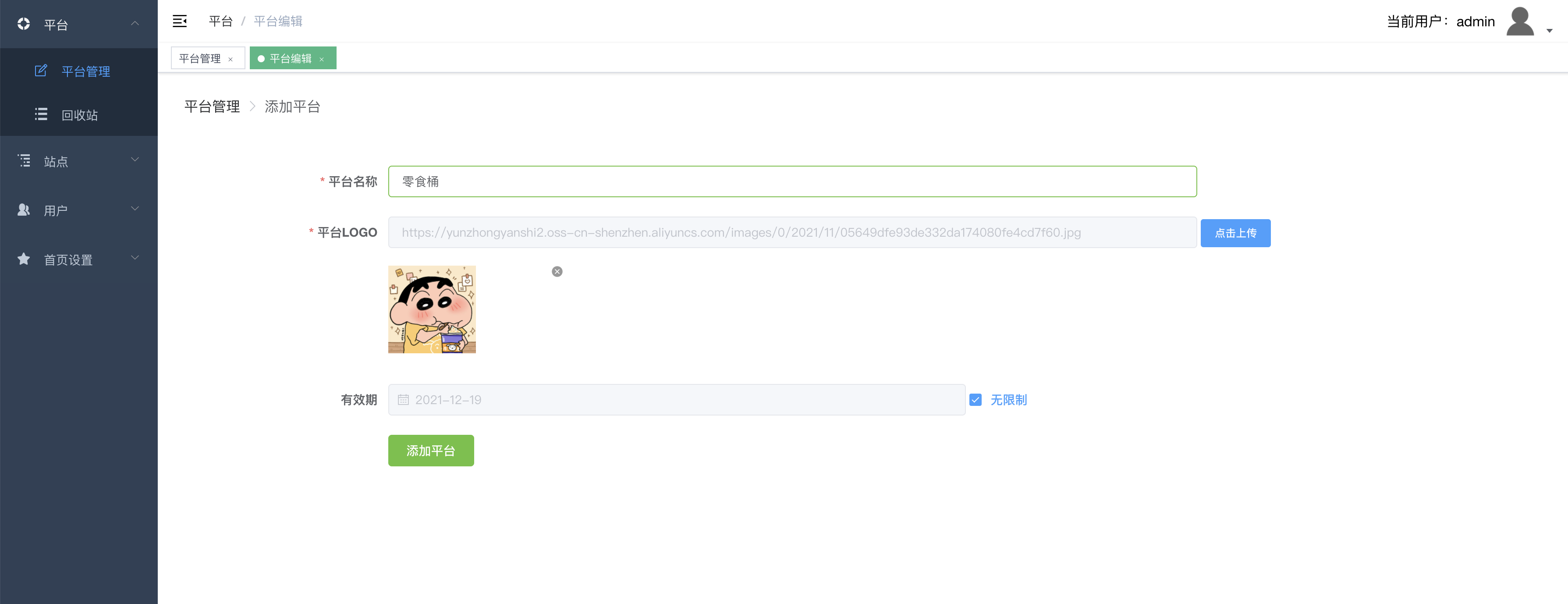 - 2编辑:可以编辑平台名称、logo、有效期;