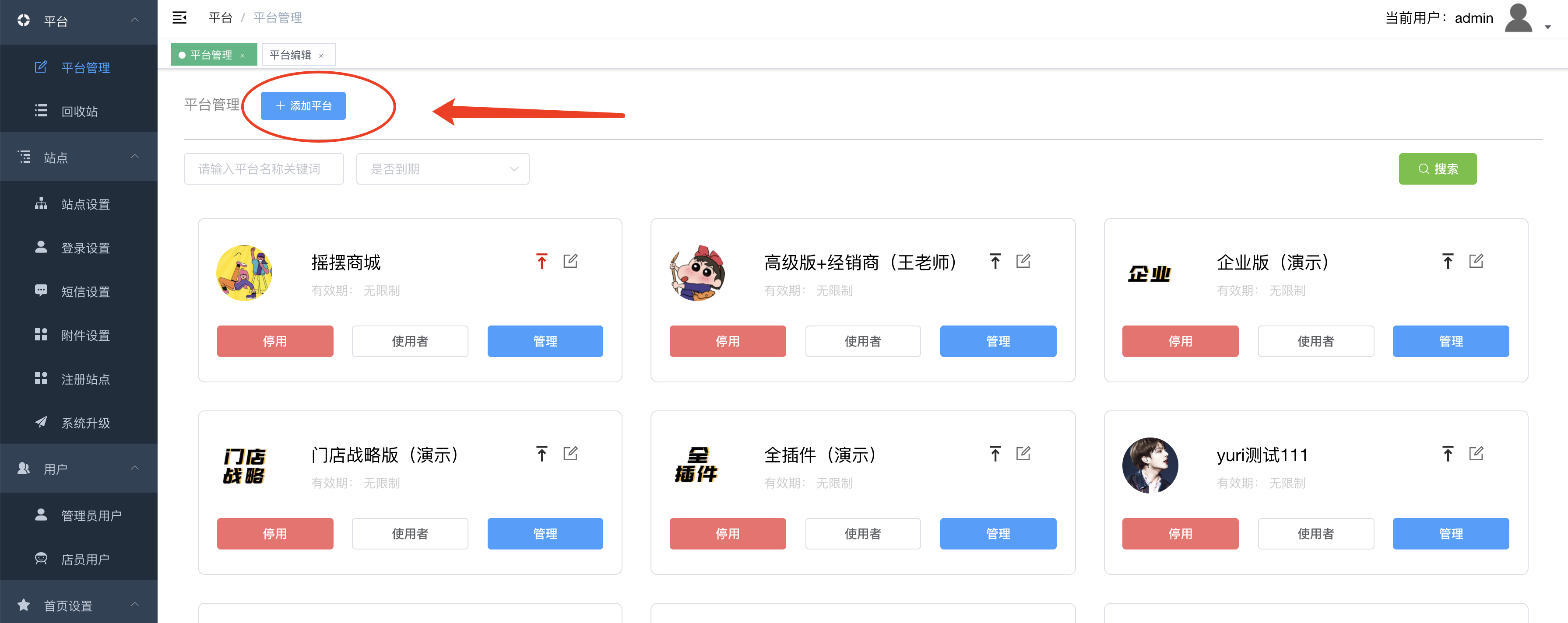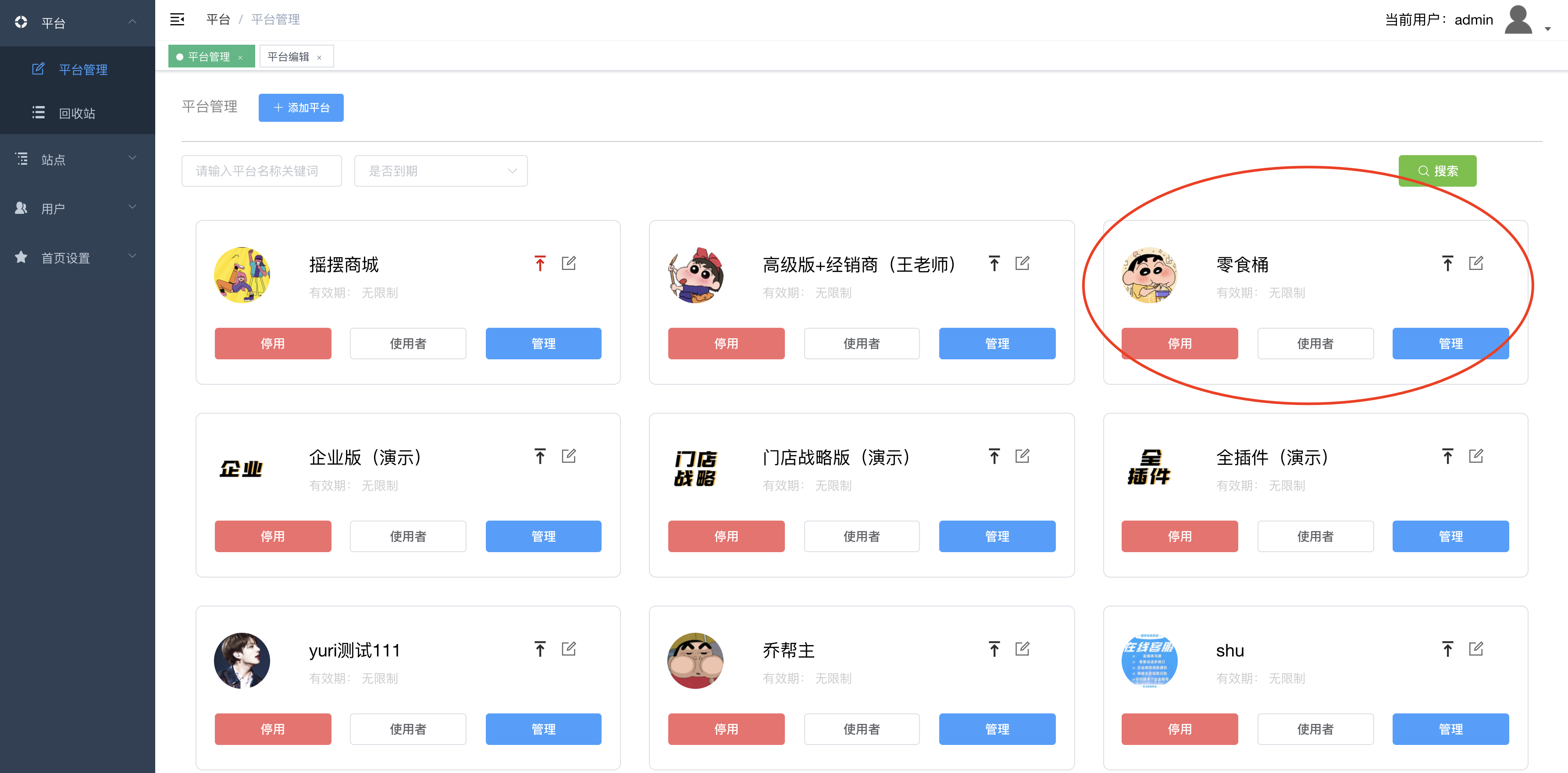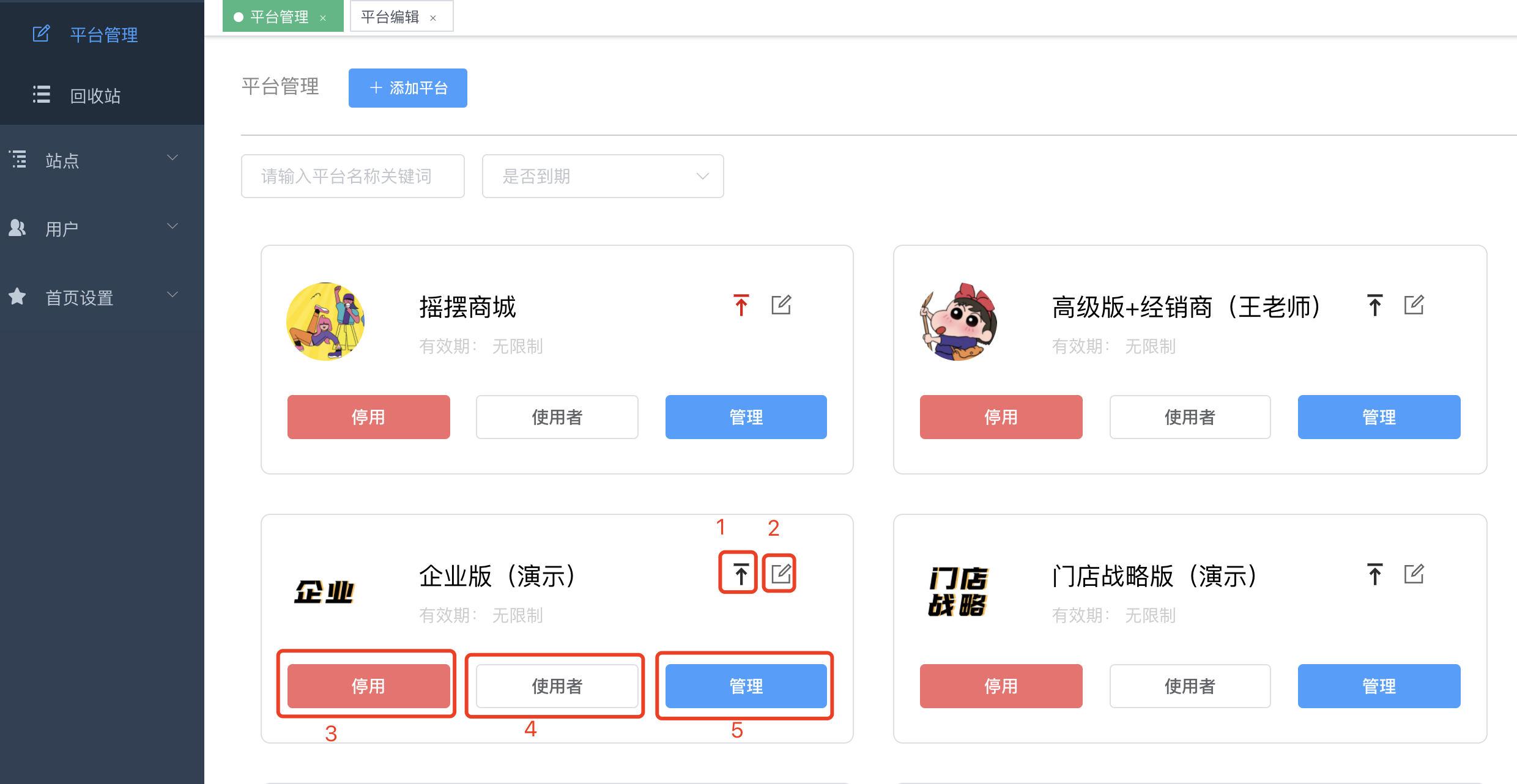 - 3停用:停用后该平台将进入回收站,用户无法继续使用,可在回收站中还原;