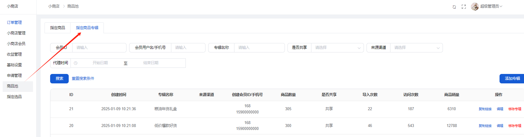 可以添加专辑,对应专辑添加商品,如基础设置–专辑库选择的是指定专辑,小商店店长–点击专辑管理,只能返回指定专辑的数据!