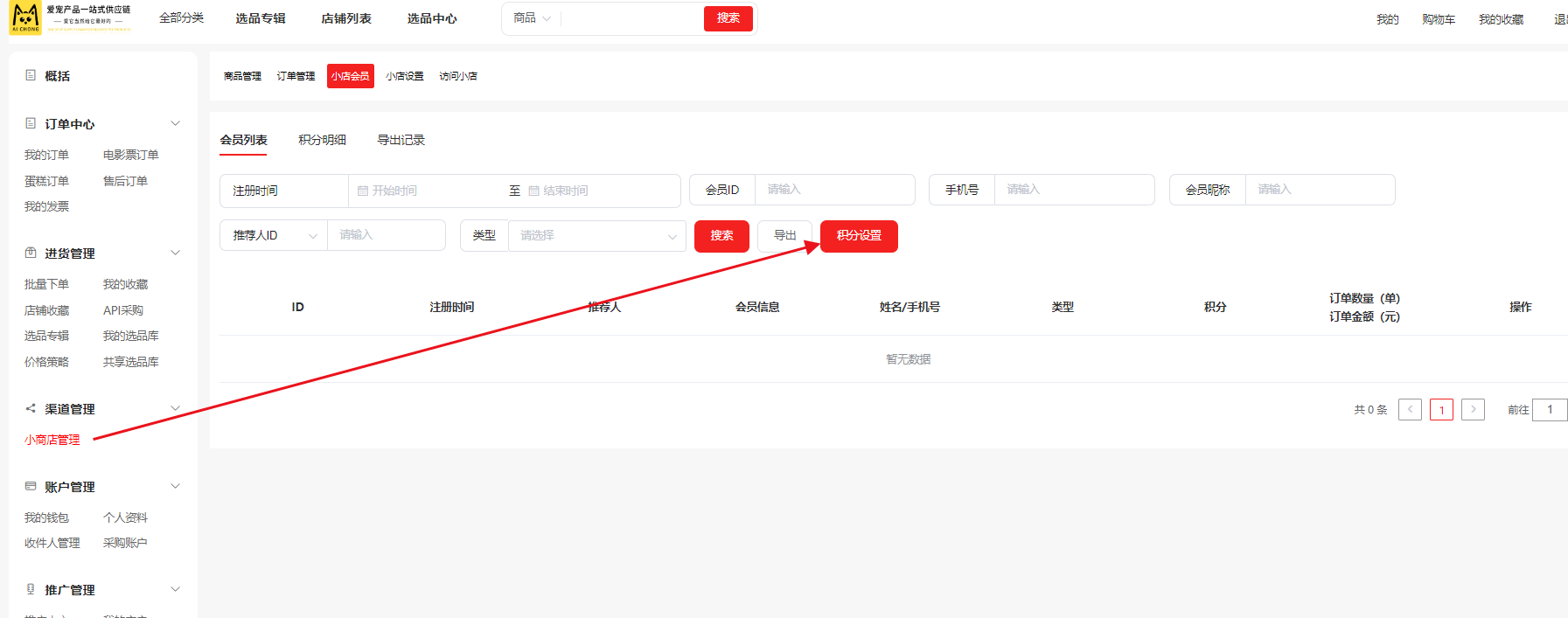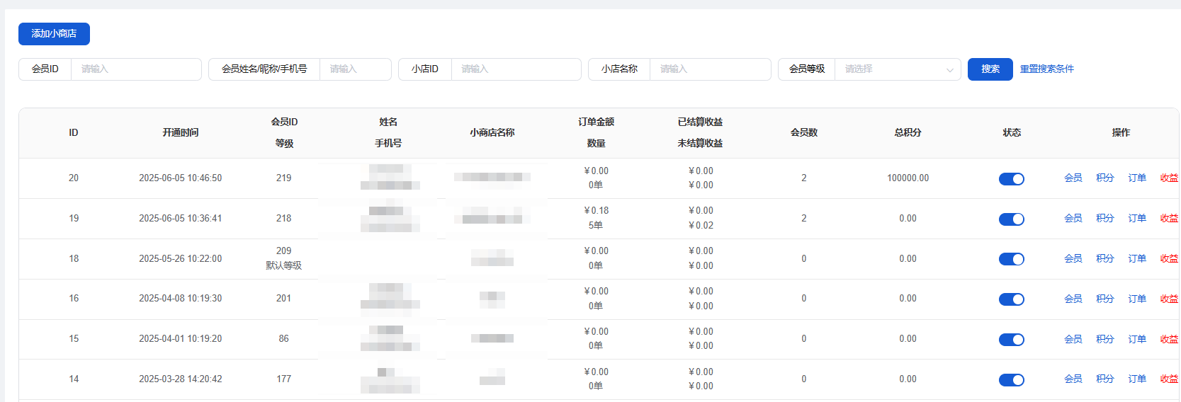 显示所有的小商店列表,支持查看小商店会员、积分、订单、收益等。