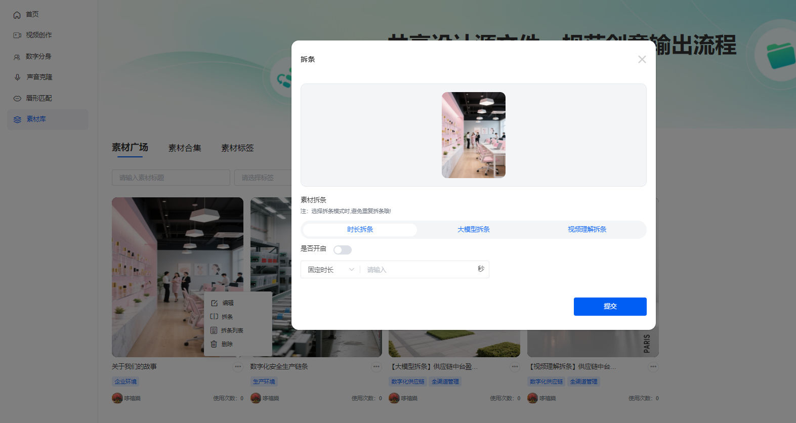 1)展示所有已上传的素材,可以对上传的素材视频进行拆条