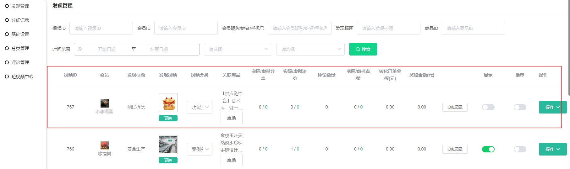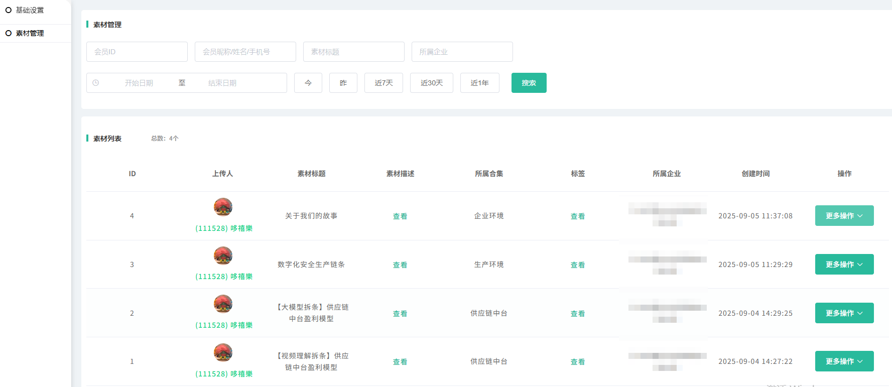 展示所有发布的素材,可以通过会员ID/昵称/手机号/所属企业进行筛选