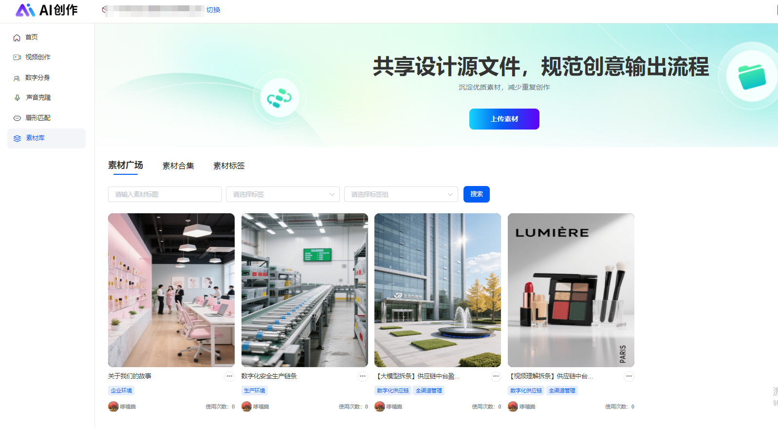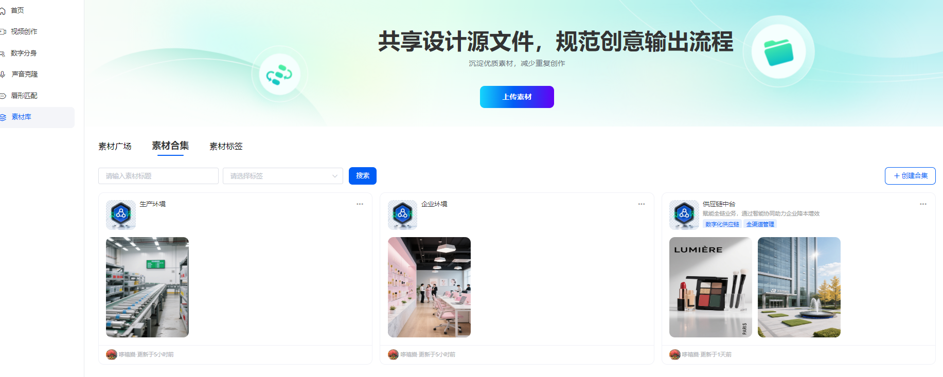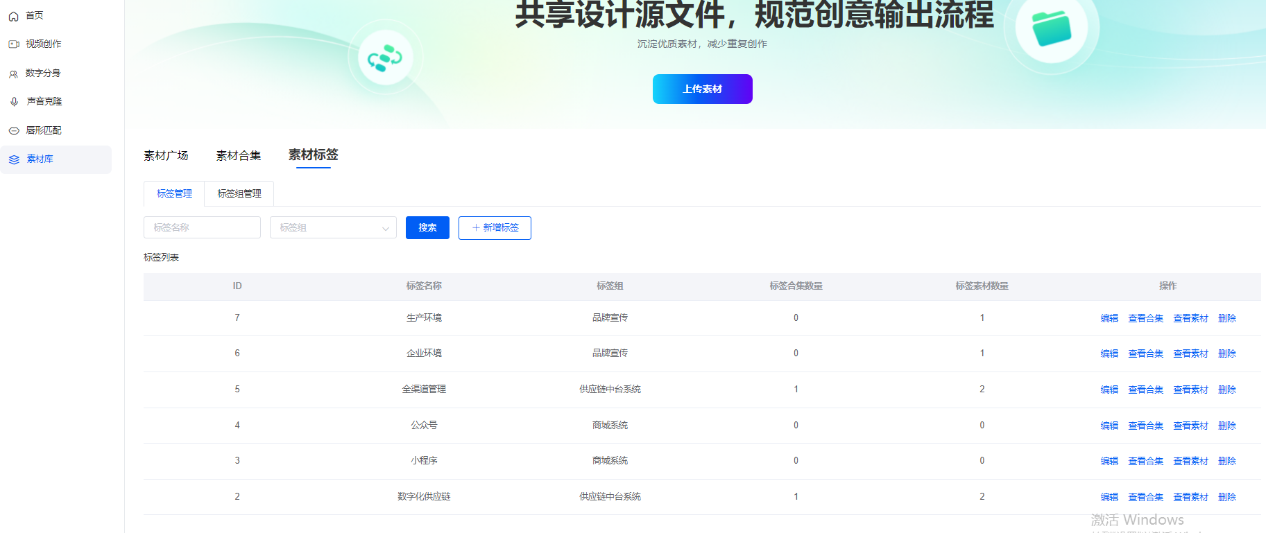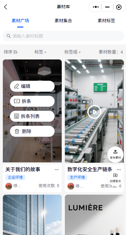 2、点击素材库进入,页面展示素材广场/素材集合/素材标签,可以进行发布素材,创建集合,新增标签等
