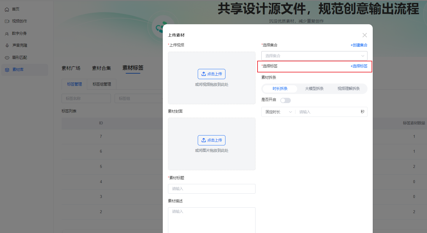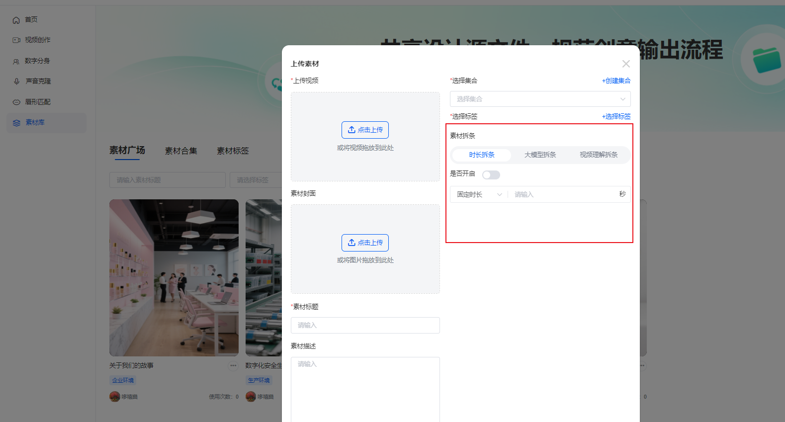 上传素材后可以对素材进行拆条,主要上传视频系材,并调用腾讯云媒体处理和数据通视频理解能力进行视频拆条