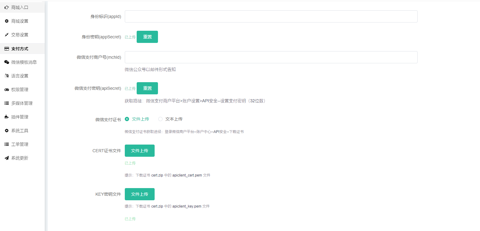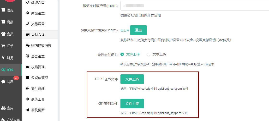 申请API证书下载安装包里的这两个文件后台分别上传到对应位置。建议自行保管好已下载的api证书文件和微信支付密钥。