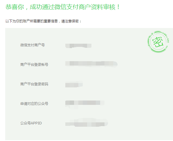 2、微信支付商户号:公众号申请微信通过后,微信会发一封邮件,里面就包含了微信支付商户号和微信支付商户平台登录账号密码